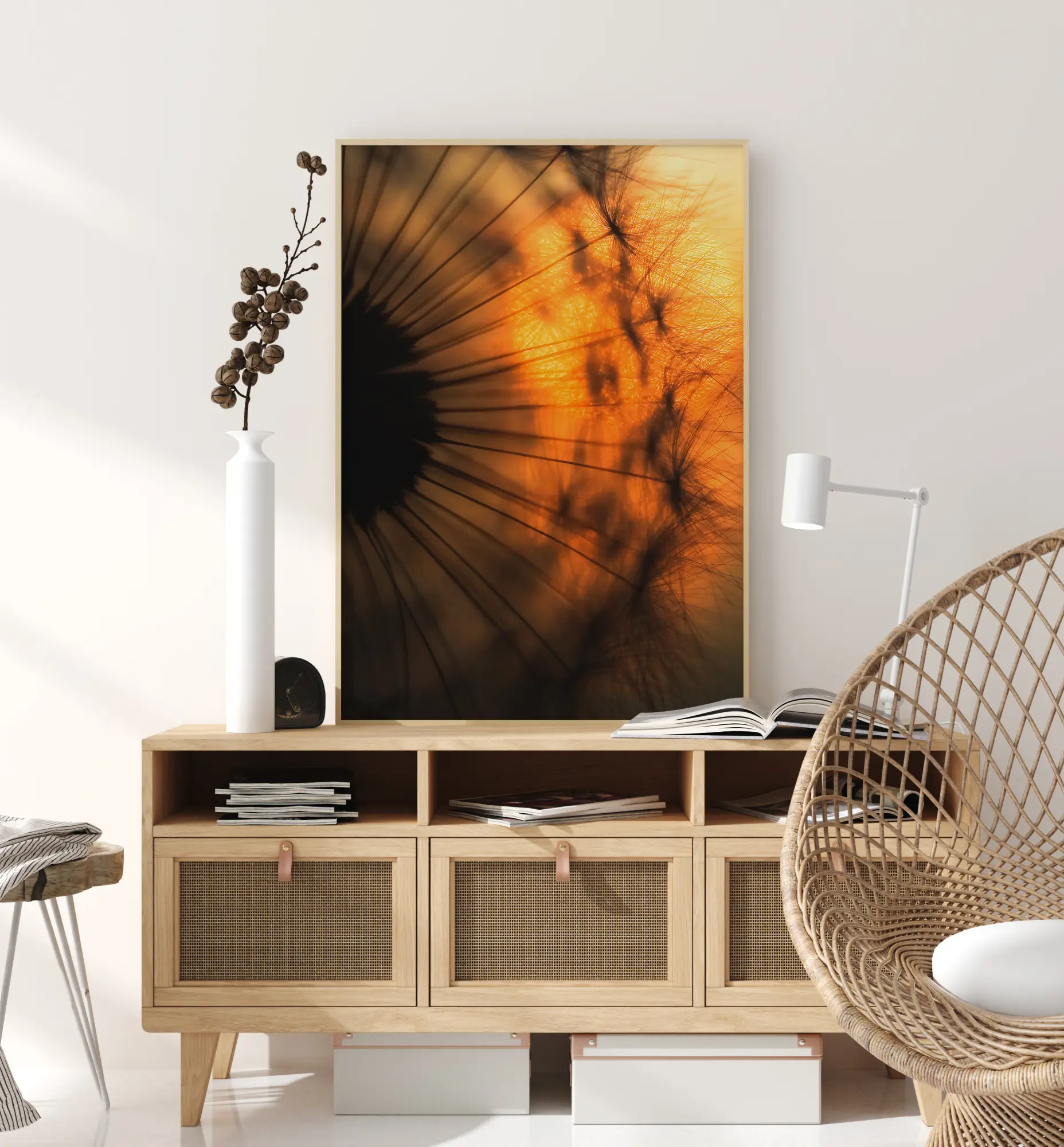 Egy közeli poszter egy pitypang órájáról, amelyen átragyog egy világos piros naplemente. A nap világos narancssárga tónusait csillapítja a nagy pitypangfej, amely tükrözi a nap hatalmas formáját, ami éppen csak látszik a magokon keresztül ebben az epikus nyomatban.