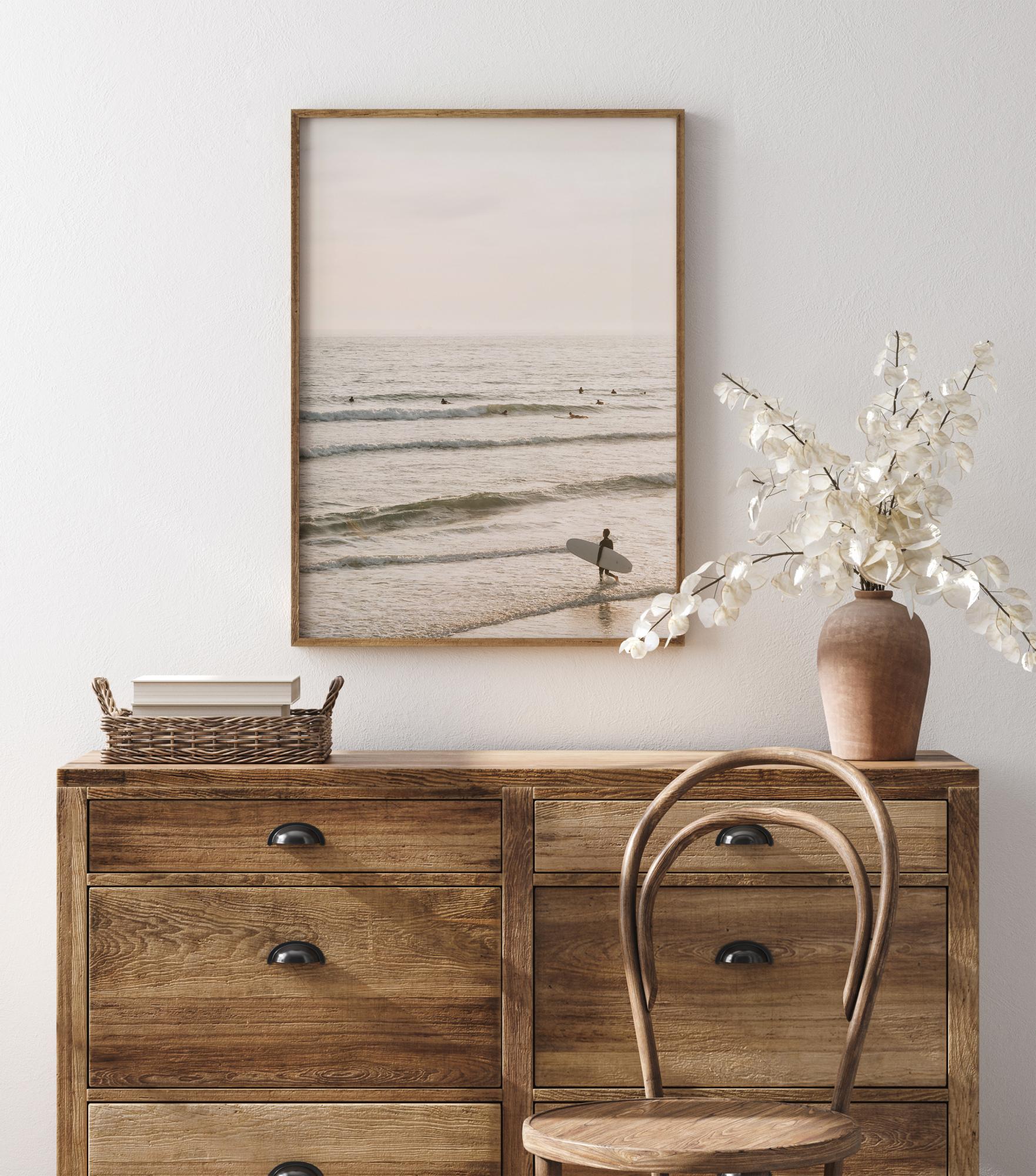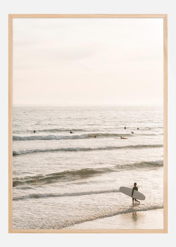Egy poszter egy tengerrel tele szörfösökkel, akik a következő nagy hullámra várnak. Kis fejek ringatóznak messze a tengerben, és egy utolsó szörfös sétál be a hullámok közé a deszkájával. A tenger nyugodt a lágy reggeli fényben, és a levegőben van egyfajta várakozás.