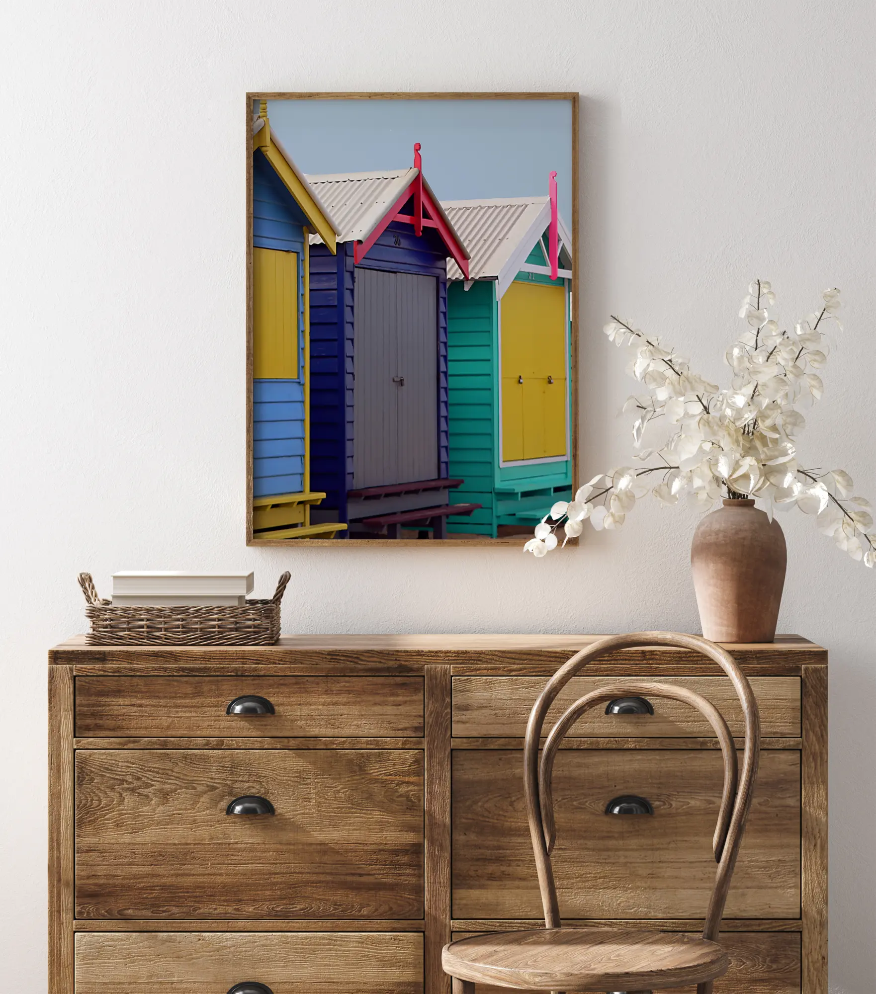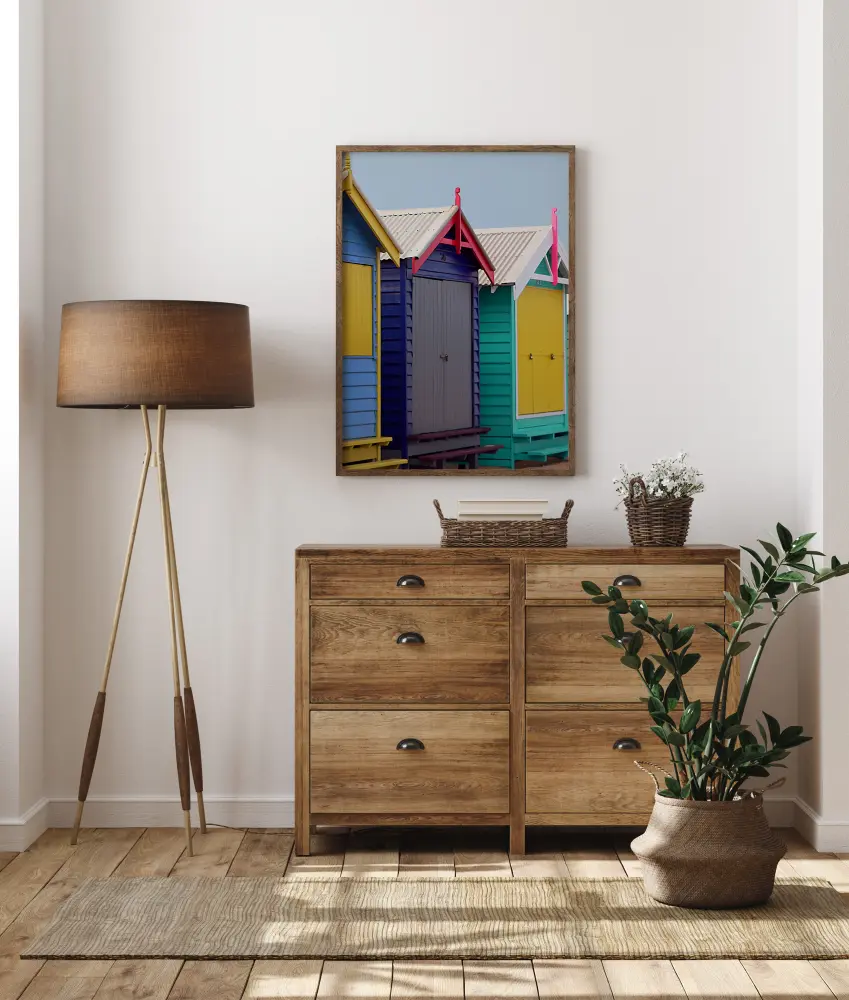 Egy világos poszter színes strandkunyhókkal. Minden kunyhó több élénk színre van festve, mint sárga, kék, rózsaszín és türkiz. Érezze a nyári strand hangulatát, amikor ezt felakasztja egy semleges falra, és színt visz otthonába.