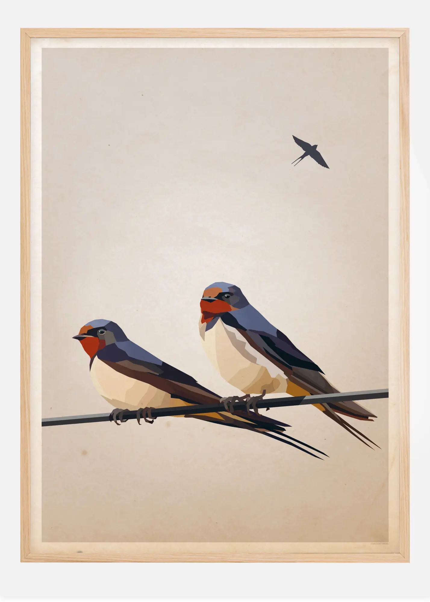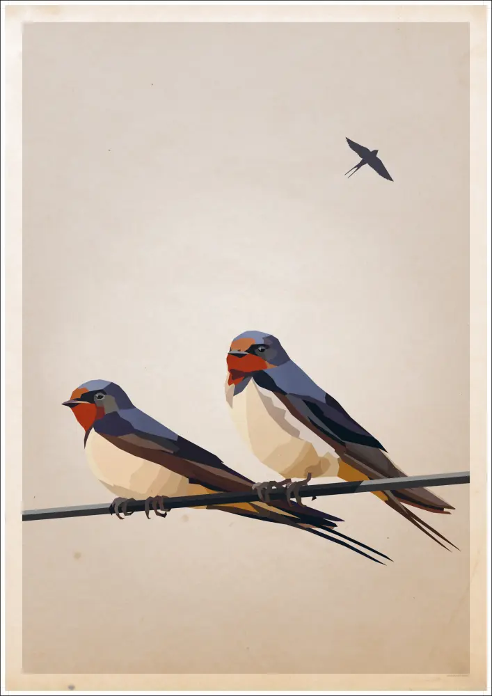 Egy állatposzter három színes mezőkkel ábrázolt fecskével. Két vörös arcú madár ül egyetlen szálon, amely a kép alsó részén feszül. Egy harmadik madár messzire repül. A fecskék világos kék és piros színei jól mutatnak majd egy egyszerű semleges falon otthon.