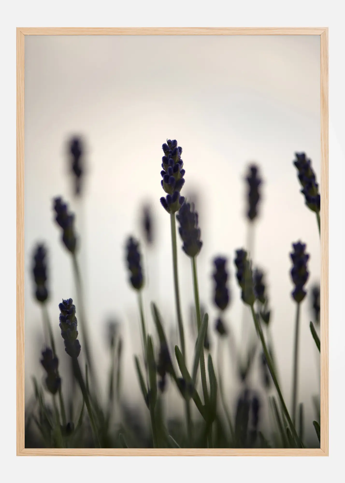 Egy virágposzter, amelyen levendulavirágok közeli képe látható egy mezőn. Ha alaposan megnézed, láthatod a lila bimbókat, amelyek a zöld szárak tetején lengedeznek. Egyenesek, egyszerű fehér háttér előtt állnak, ami tökéletes kiegészítője egy színes szobának.