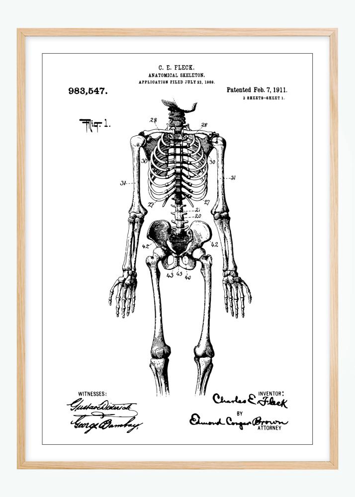 Ez a pedagógiai és részletgazdag szabadalmi poszter egy anatómiai csontvázmodellt mutat be, amely a 983.547-es számú szabadalomban szerepel. A szabadalmat 1911. február 7-én adták meg C. E. Flecknek, és érdekes példája a korai orvosi pedagógiának és dizájnnak. FIG. 1 a csontvázat teljes alakjában mutatja be, amely világos áttekintést nyújt a test szerkezetéről és a csontok elhelyezkedéséről.