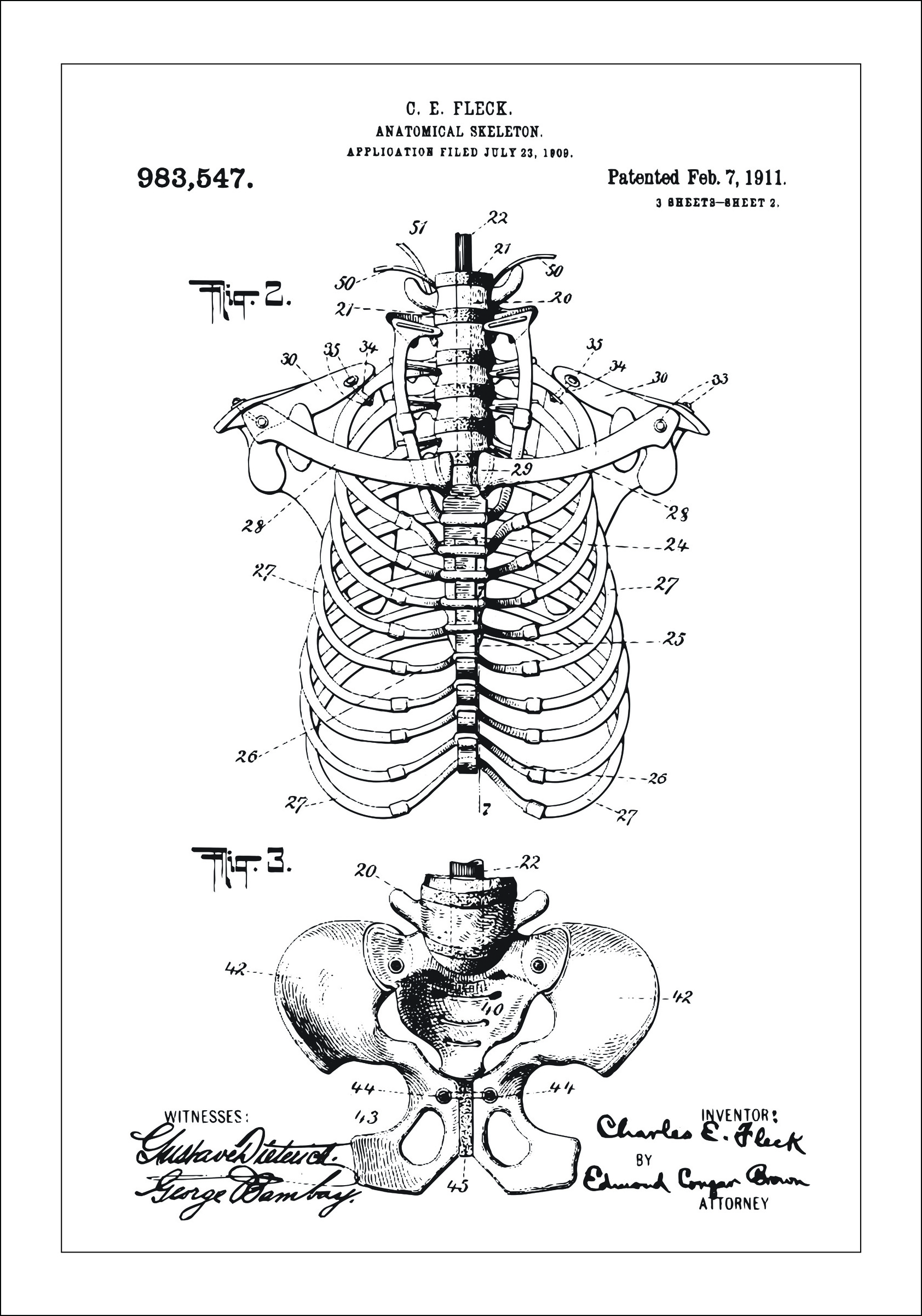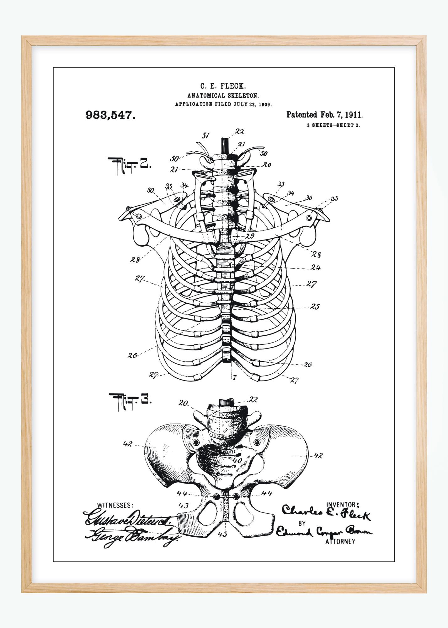 Ez a szabadalmi poszter részletes illusztrációt mutat be egy anatómiai csontvázszerkezetről, amelyet C.E. Fleck szabadalmaztatott 1911. február 7-én, a 983,547-es szabadalmi szám alatt. A rajzot 1909. július 23-án nyújtották be, és kiemeli a csontváz felépítését és mechanikai kapcsolatait, különösen azt, hogyan vannak a bordák és a gerinc megtervezve a pontos és oktató jellegű emberi anatómia ábrázolására.