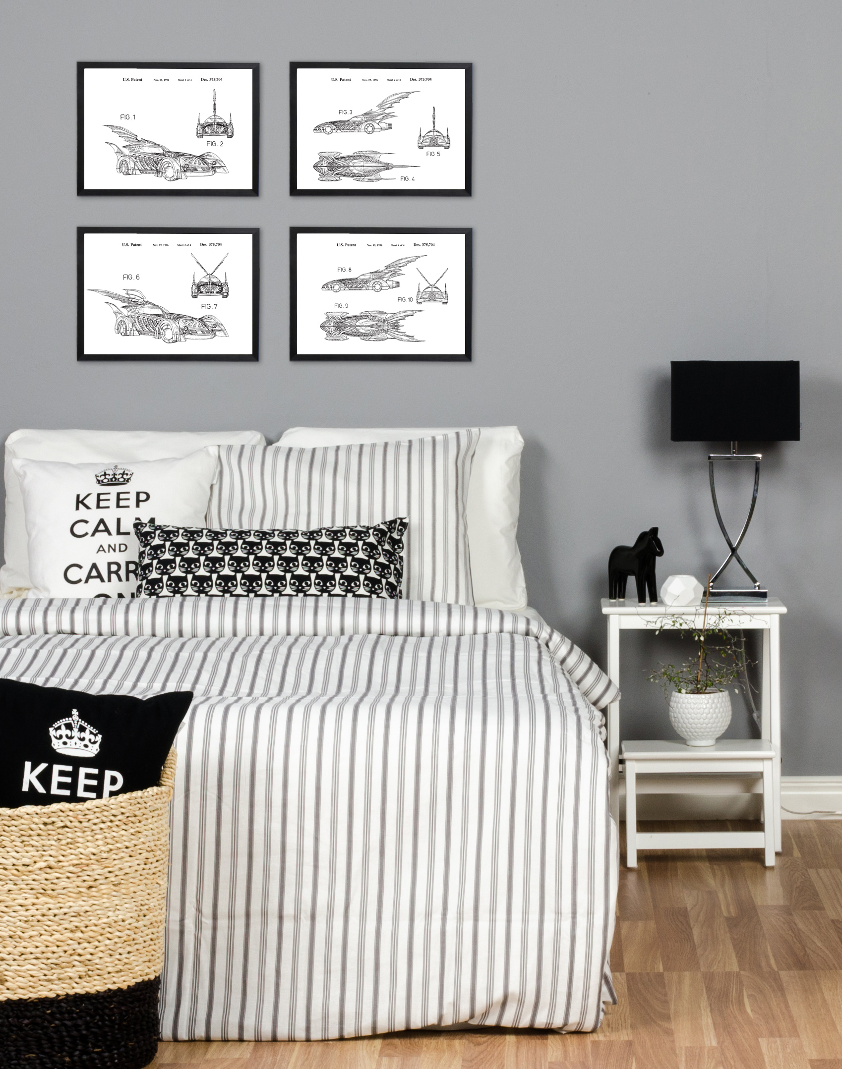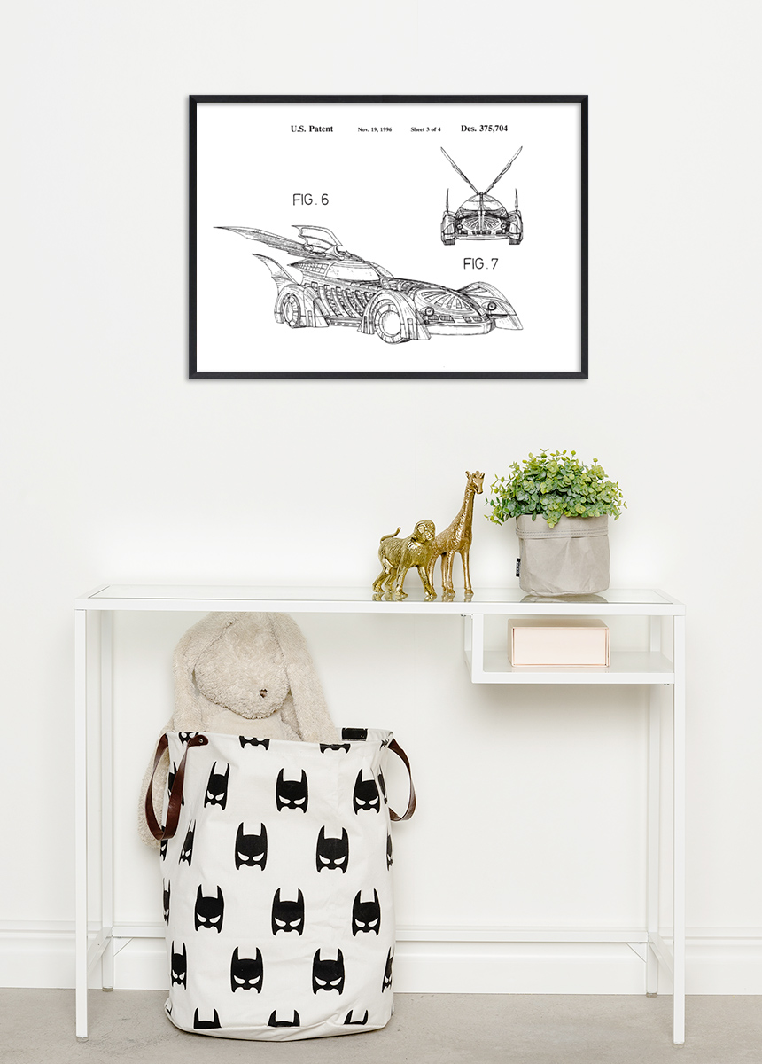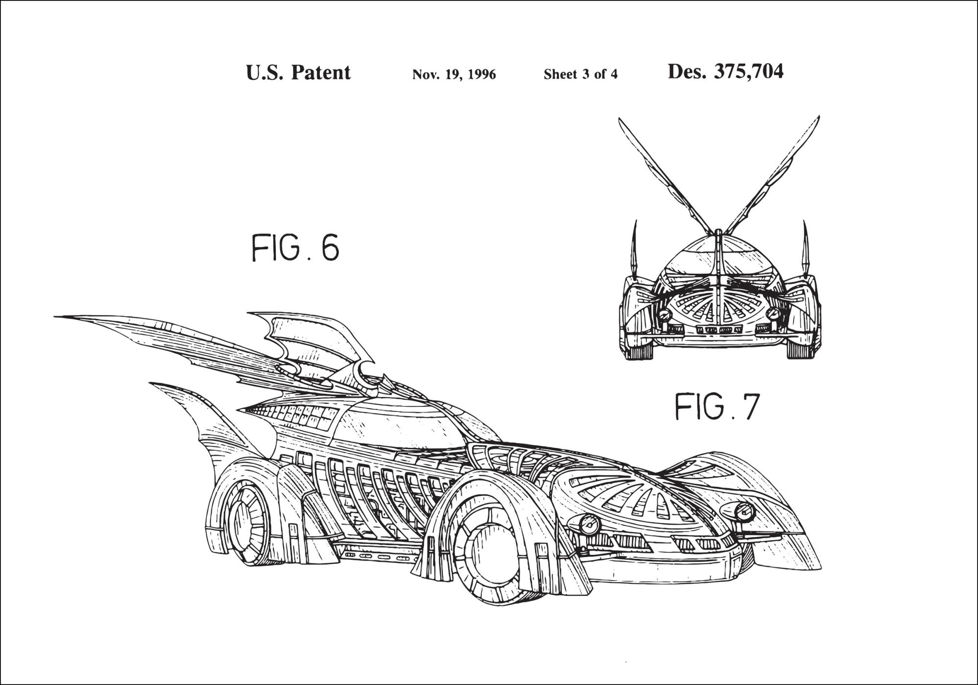 Egy merész és fantáziadús motívummal ez a szabadalmi poszter exkluzív bepillantást nyújt egy rendkívüli jármű tervezési folyamatába. Az amerikai szabadalomban Des. 375 704, amelyet 1996. november 19-én adtak ki, a FIG. 6 és FIG. 7 két különböző perspektívát mutat egy Batmobile-ról, amely kiemelkedik áramvonalas sziluettjével és drámai stílusával. Ennek a szabadalmi rajznak a részletei, a söprő vonalaktól a nagy, díszes szárnyakig, ellenállhatatlan dekorációs elemmé teszik gyűjtők és formatervezési rajongók számára.