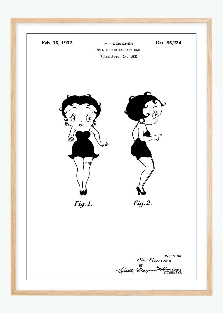 Ez a játékos és nosztalgikus szabadalmi poszter Betty Boopról, M. Fleischer tervezésében, amely az amerikai szabadalmi hivatal által 1932. február 16-án, Des. 86,224 szám alatt jelent meg. Az 1931. szeptember 24-i benyújtási dátummal ez az illusztráció a játéktervezés kedvelt korszakát tükrözi. A poszter, amely a babát két különböző pózban mutatja, ellenállhatatlan dekorációs tárgy gyűjtők számára, vagy bájos kiegészítő egy gyerekszobába.