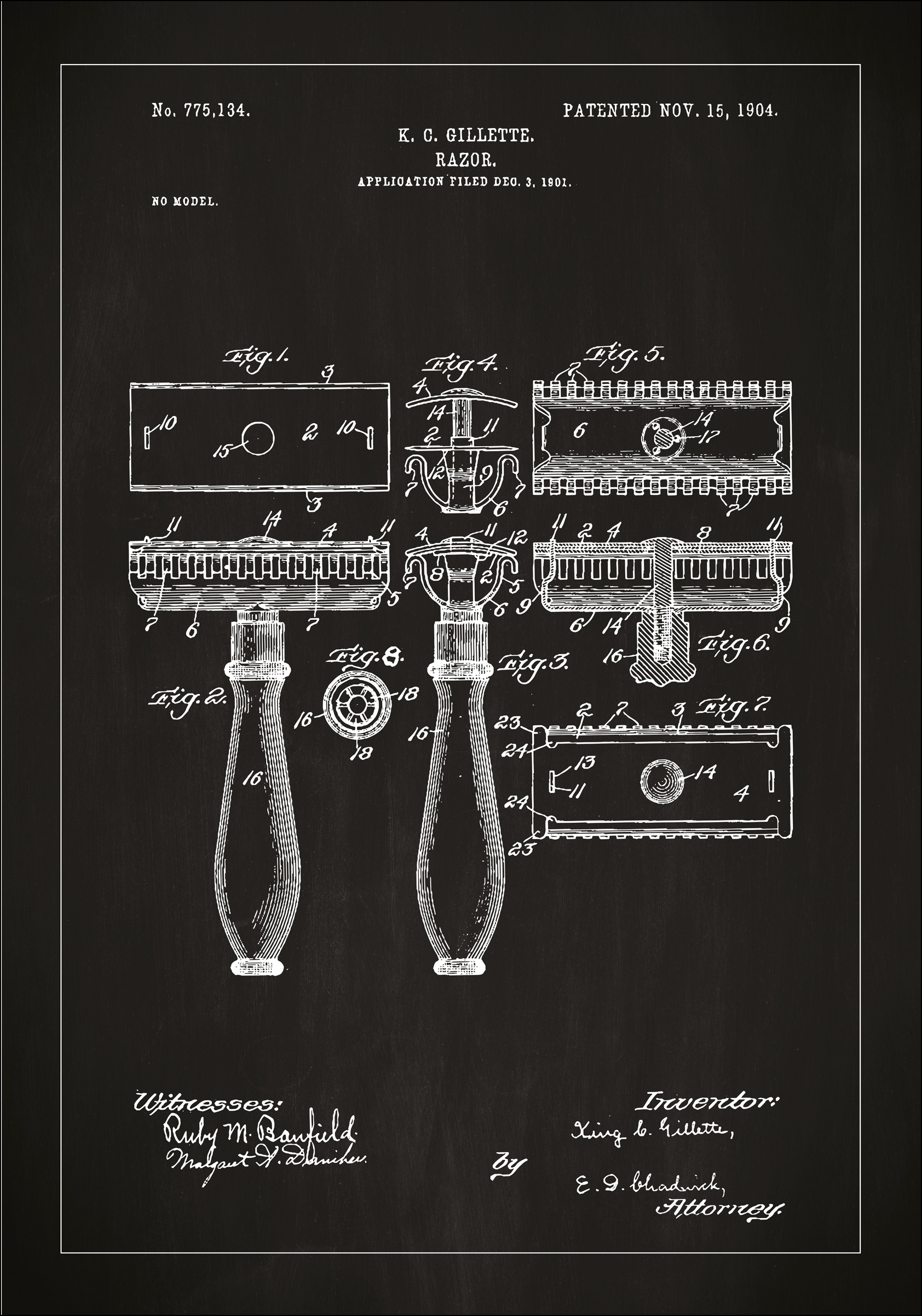 Ez a szabadalmi poszter exkluzív bepillantást nyújt a személyi ápoláshoz használt egyik legfontosabb eszköz, nevezetesen a borotva, tervezésébe. A szabadalmat, amelyet K.G. Gillette kapott meg 1904. november 15-én a 775,134 szám alatt, egy forradalmi változást illusztrál az emberek napi borotválkozási rutinjában. Ez egy részletes szabadalmi rajz, amely különféle perspektívákat és elemeket mutat be, amelyek újszerűek voltak abban az időben.