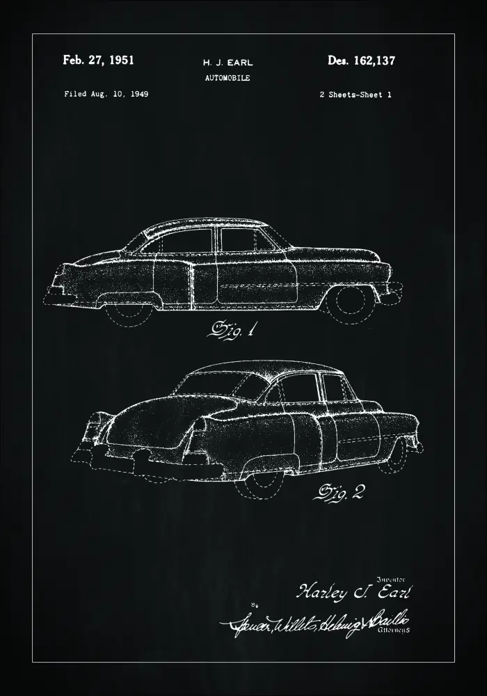 Ez a szabadalmi poszter elegáns képet mutat be egy Cadillacról, amelyet 1951. február 27-én szabadalmaztatott H.J. Earl a Des. 162,137 szabadalmi szám alatt. Ezen rajz részletei, amelyet 1949. augusztus 10-én nyújtottak be, megragadják az autóipar korára jellemző dinamikus formát és innovatív dizájnt. Az oldalnézet és a háromdimenziós szög egyedi betekintést nyújt az autó arányaiba és karosszériájának tervezésébe, bemutatva az 1950-es évek jellegzetes stílusát és szépségét.