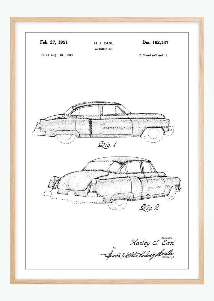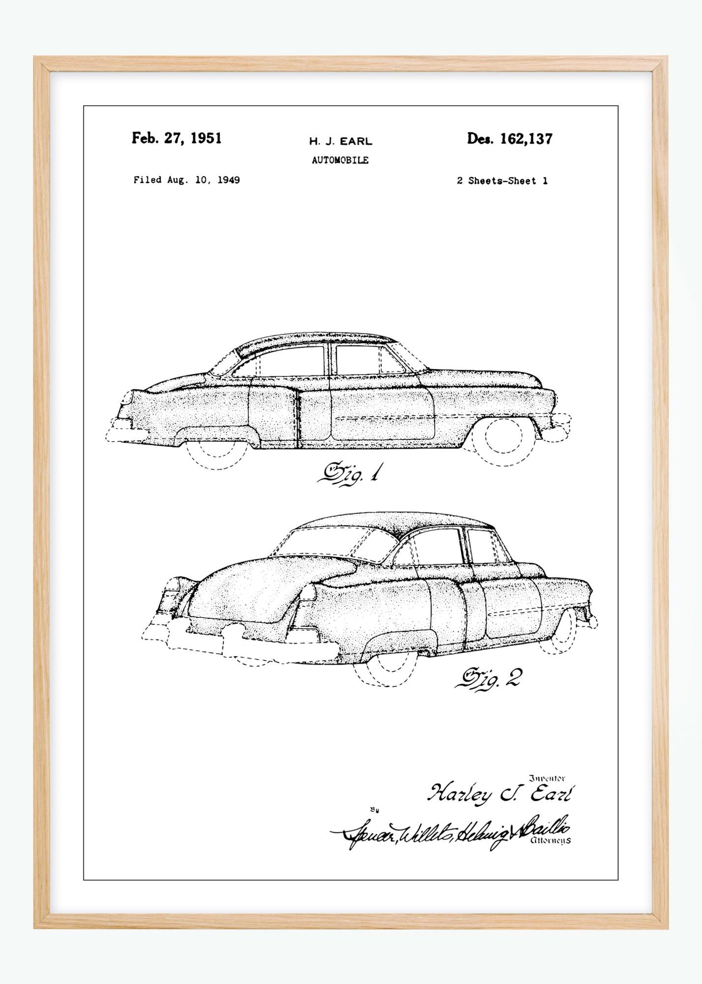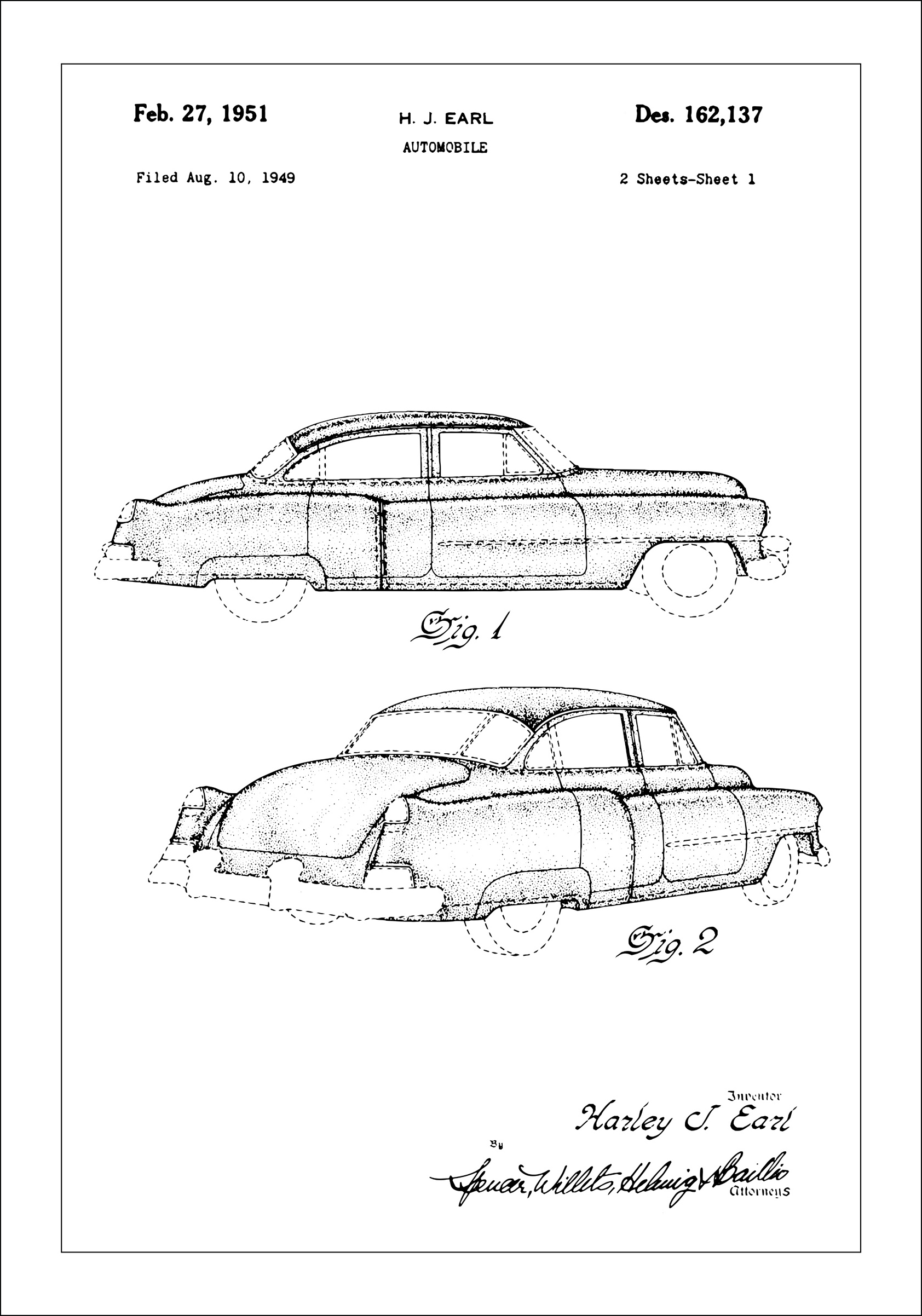 Ez a szabadalmi poszter egy kifinomult Cadillac autórajzot mutat be, amelyet a híres H.J. Earl tervezett. A 1951. február 27-ei dátummal, Des. 162,137 szabadalmi számmal, eredetileg 1949. augusztus 10-én benyújtva, ez a kép megragadja a háború utáni autóipar lényegét. A motívum az amerikai autók aranykorának tisztelgése, és olyan részletgazdagsággal készült, amely mind az autógyártók, mind a dizájn szerelmeseinek vonzó.