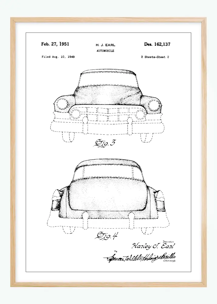 Ez a stílusos szabadalomposzter egy ikonikus Cadillacet ábrázol, tisztelgés a 20. századi járműtechnikai fejlődés előtt. A H.J. Earl által tervezett és 1951. február 27-én Des. 162,137 szám alatt szabadalmaztatott rajz elengedhetetlen mindazok számára, akik értékelik a klasszikus autó esztétikáját és dizájn történetét. A poszter az autót profilból, elölről és hátulról mutatja, az illusztrációk részletgazdagsága nosztalgiát és csodálatot vált ki.