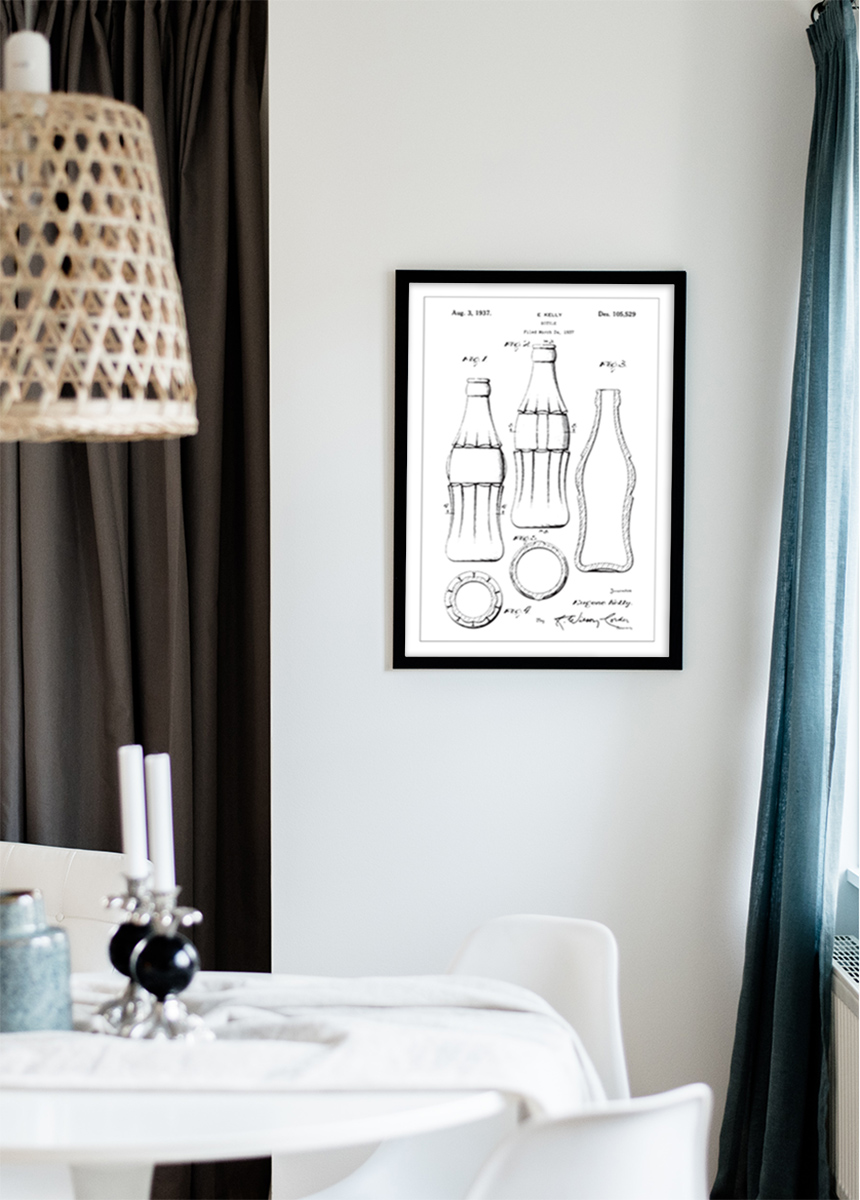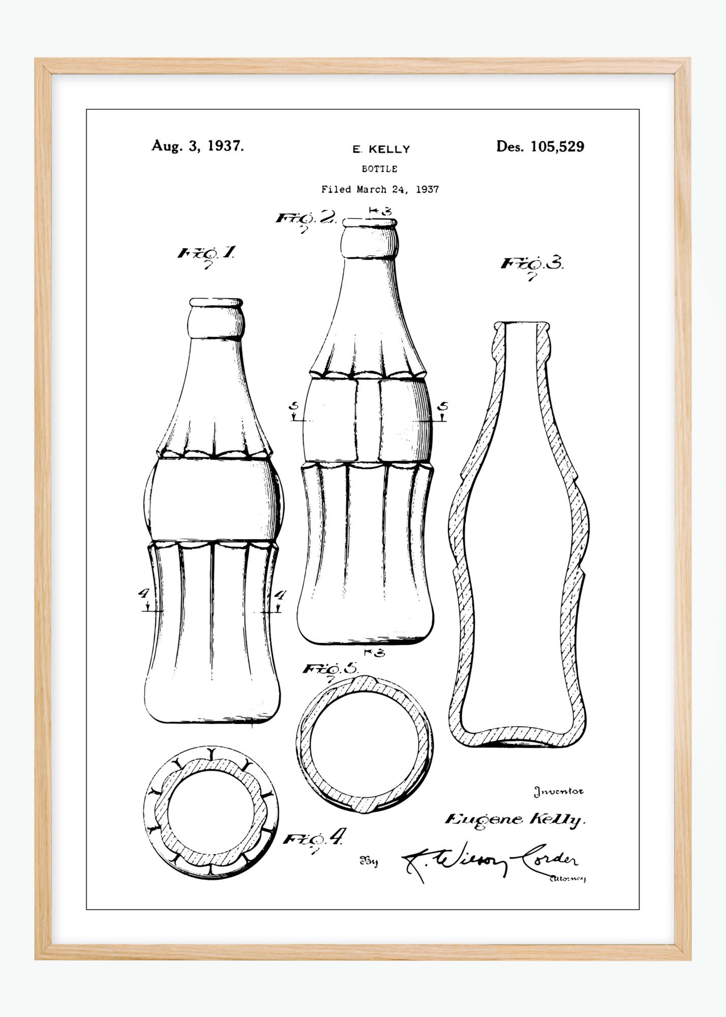 Ez a szabadalmi poszter a CocaCola palack tervezését mutatja be, amelyet E. Kelly kapott 1937. augusztus 3-án a Des. 105,529 számú szabadalom alatt. Az illusztráció bemutatja a palack részletes körvonalait és arányait több szögből, teljes képet adva a dizájnról. A palack ikonikus formája szinonimává vált az általa tartalmazott termékkel, és az arculattervezés és a terméktervezés időtlen képviselete.