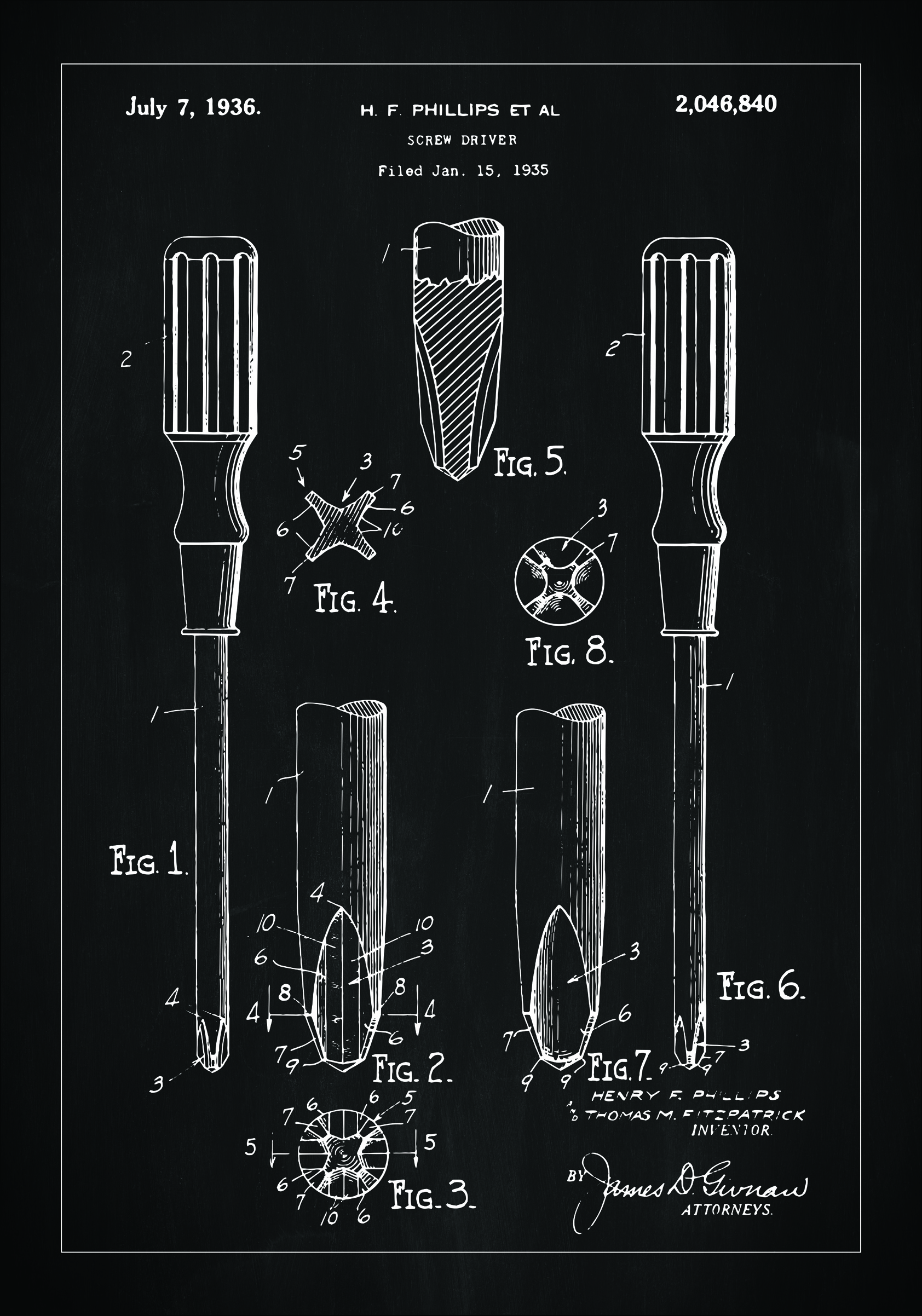 Ez a szabadalom poszter bemutatja az ikonikus eszközt, amely forradalmasította a szerelőmunkát: a csavarhúzót, a 2,046,840-es szabadalmi szám alatt. 1936. július 7-én keltezve, a feltaláló H. F. Phillips által készített részletes rajz egy klasszikus kéziszerszám-tervet mutat be. A képen minden ábra a csavarhúzó különböző perspektíváit és összetevőit ábrázolja, a nyéltől a hegyéig, bemutatva az átgondolt konstrukciót.