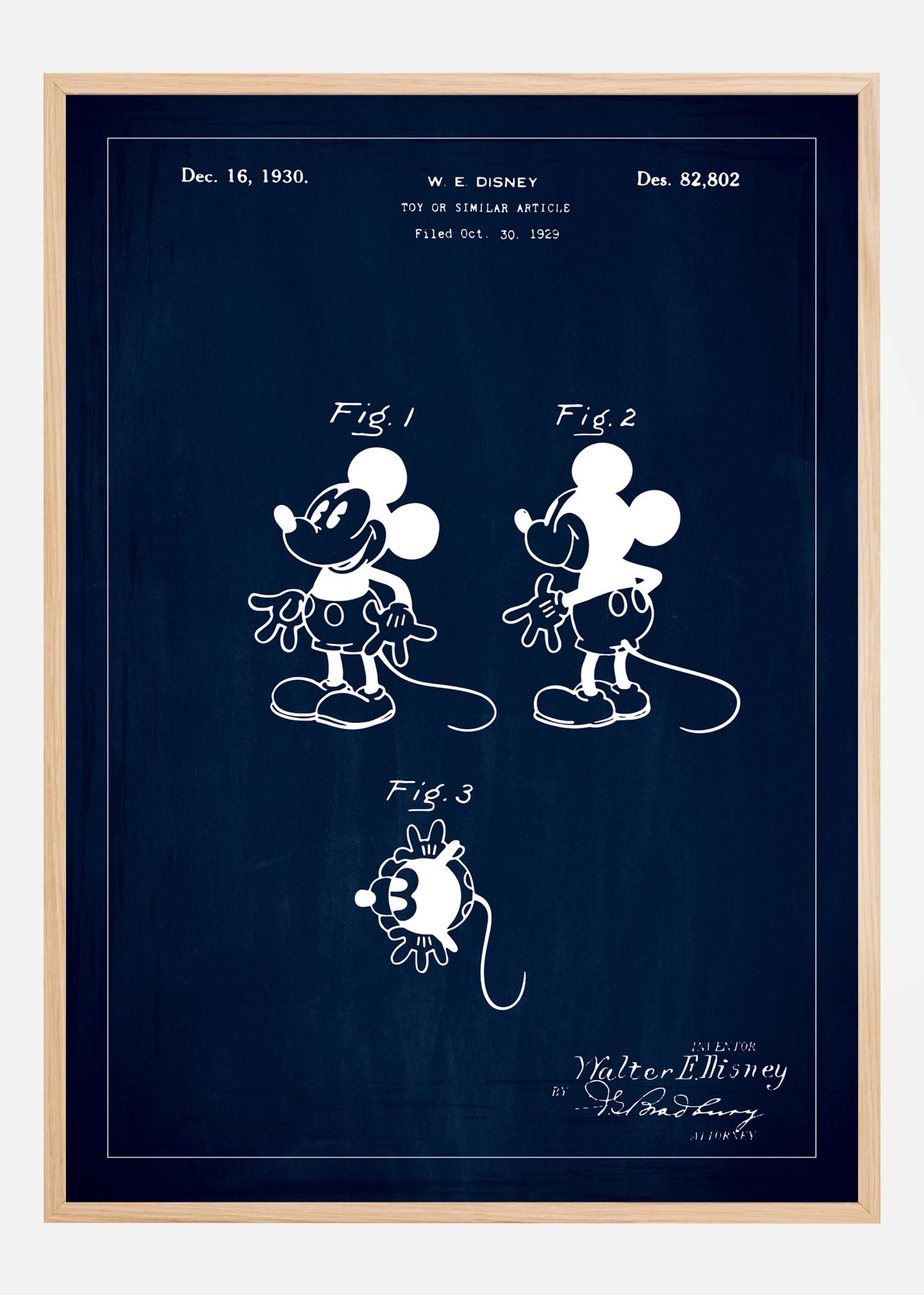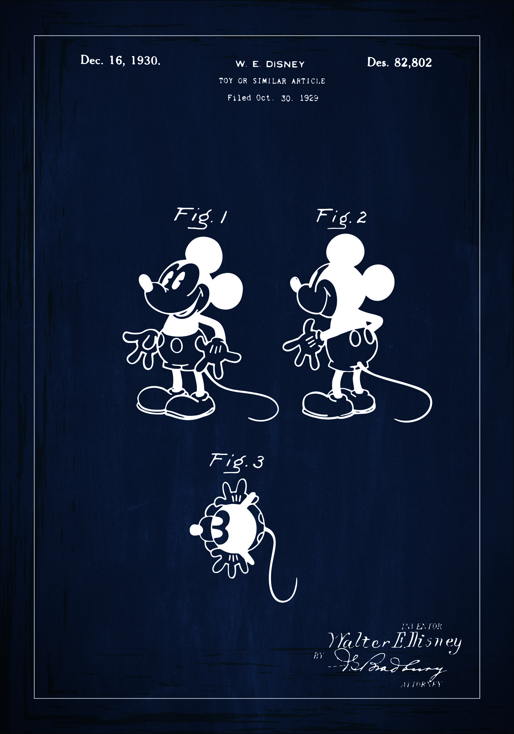 Ez a szabadalomposzter egy időtlen dizájnklasszikusra helyezi a hangsúlyt, amelyet a Des. 82,802 számú szabadalom dokumentál, W.E. Disney által kiadva 1930. december 16-án. A motívum három alakot tartalmaz Mickey egérből, amelyek különböző nézeteket és részleteket mutatnak a dizájnból: egy karakter elölről, profilból és egy kéz részletét, mind számozva, hogy illusztrálják ennek az ikonikus formának a specifikus tulajdonságait.