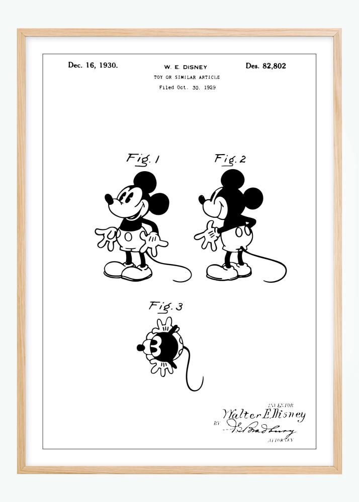 Ez a szabadalmi poszter egy Mickey egeret emel ki, amelyet W.E. Disney tervezett, és 1930. december 16-án kapott szabadalmat Des. 82,802 szám alatt. A három illusztráció különböző nézeteket mutat be a figuráról, amely megmutatja a design ikonikus tulajdonságait és báját. Ez a motívum fontos dokumentum abból az időből, amikor a játékok tervezése nagyobb szerepet kapott a populáris kultúrában és a tömegmédia területén.