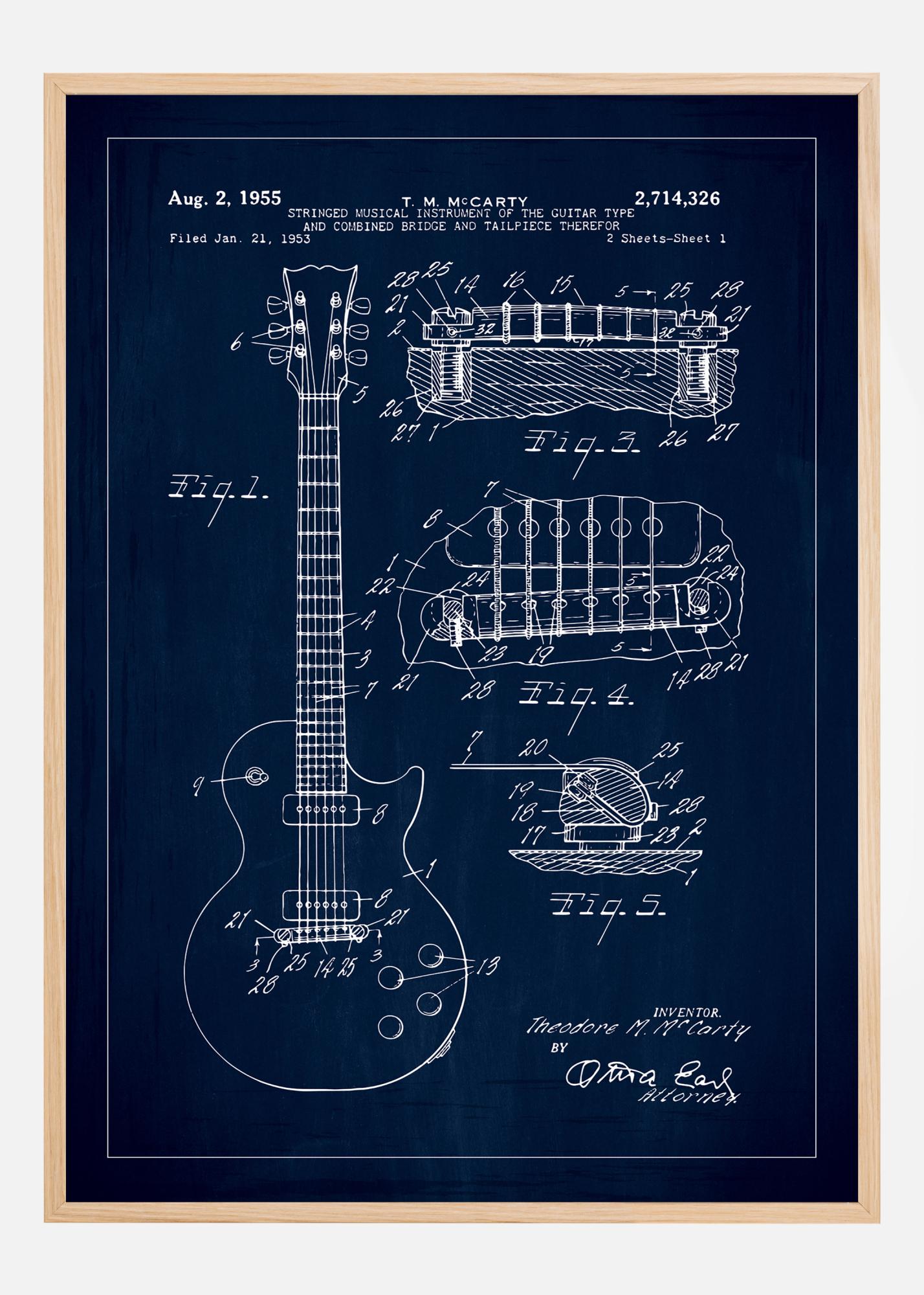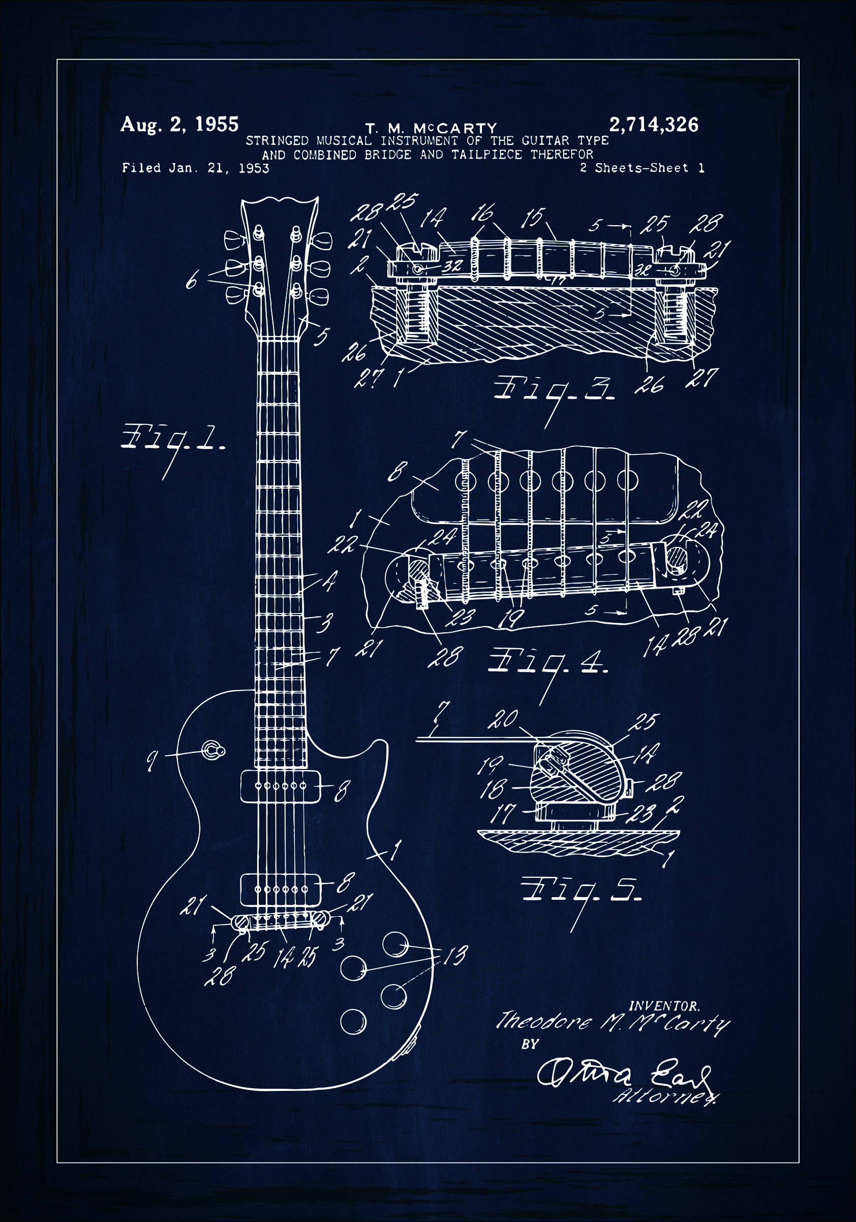 Ez a szabadalmi poszter egy vonós hangszer részletes és pontos rajzát mutatja, 1955. augusztus 2-i dátummal, a 2,714,326-os szabadalomszámmal. A hangszer szabadalmát, amelyet sokan elektromos gitárként ismernének fel, Theodore M. McCarty regisztrálta 1953. január 21-én. A poszter elegáns átfogó képen és technikailag előrehaladott részletnézetekben ábrázolja a hangszert, kiemelve annak innovatív kialakítását és a kombinált hidat és húrlábat mint egyedi tulajdonságait.