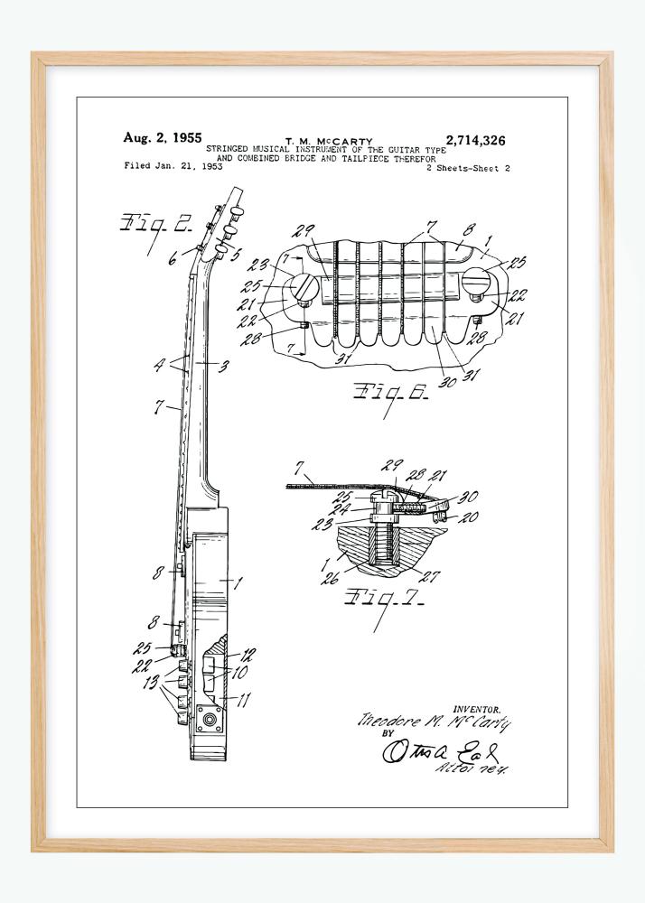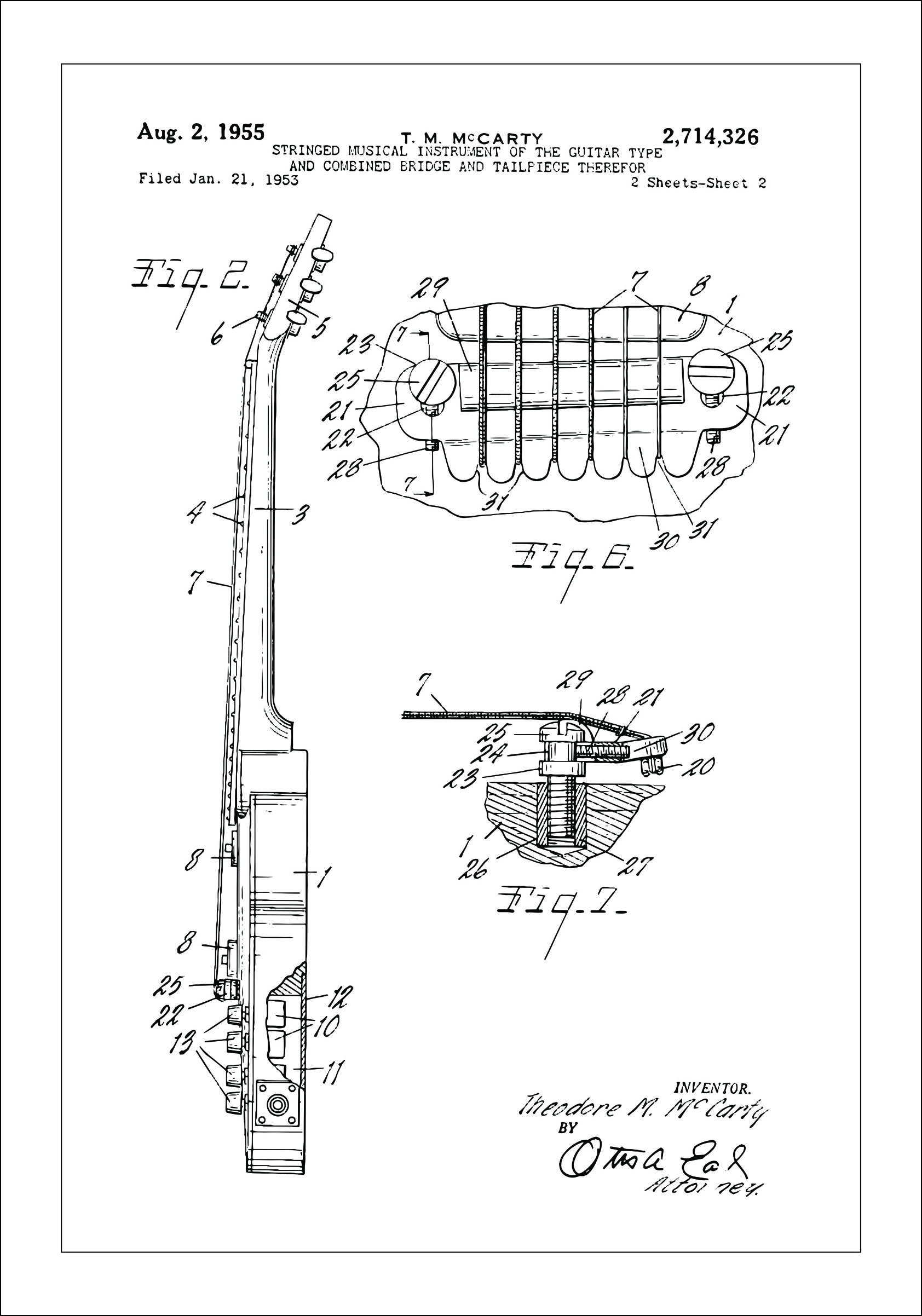 Ez a szabadalmi poszter egy húros hangszer, kifejezetten egy elektromos gitár találmányát mutatja be, amelynek szabadalmát 1955. augusztus 2-án adták meg a 2,714,326 szabadalmi számon. A feltaláló, Theodore M. McCarty, 1953. január 21-én nyújtotta be a kérelmet. Az ábrák részletes nézeteket adnak a hangszer nyakáról, testéről és fejéről, valamint egy metszeti felületet, amely megmutatja, hogyan vannak a húrok a gitár hídjával és húrtartójával összekapcsolva.
