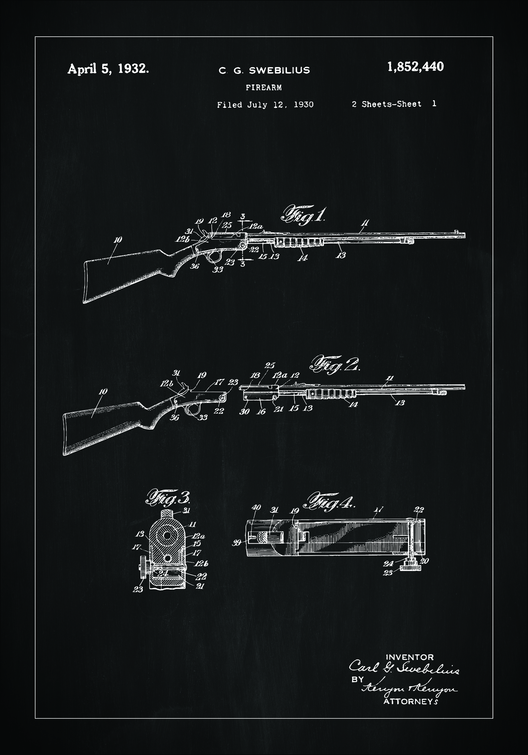 Ez a szabadalmi poszter egy részletes rajzot ábrázol egy puskáról a 20. század elejéről, konkrétan 1932. április 5-ére datálva. A szabadalmat, amelynek száma 1,852,440, 1930. július 12-én adta be a feltaláló, C. G. Swebilius. Ez a művészeti ábrázolása a puska mechanikai részleteinek kiváló példája a technikai rajzra és a dizájnra. Ez a szabadalmi rajz ügyesen mutatja be azokat a bonyolult komponenseket, amelyek együttműködnek egy funkcionális és újító termék létrehozásához. A poszter ideális gyűjtői tárgy fegyvertörténeti lelkesedők és dizájn kedvelők számára.