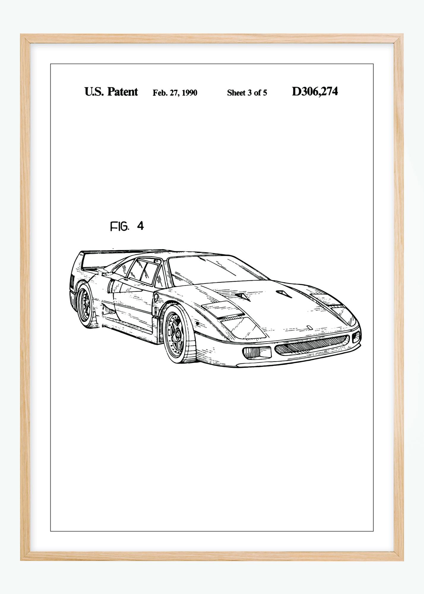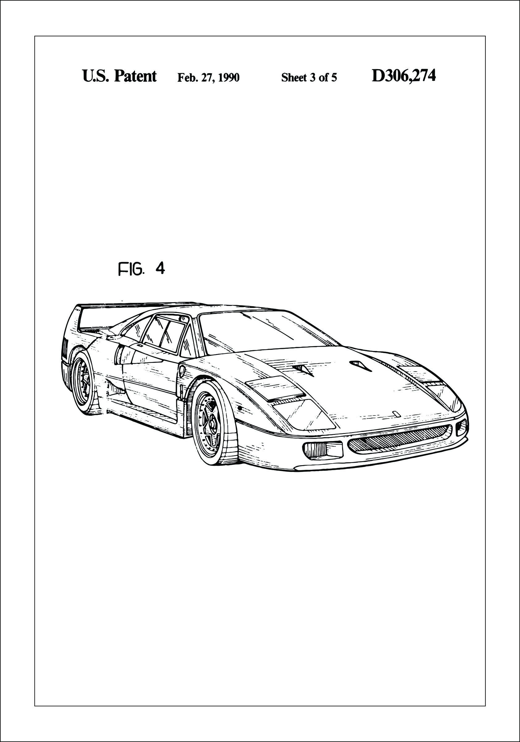 Ez a szabadalmi poszter egy úttörő Ferrari F40 dizájnt ábrázol, részletesen elkészítve 1990. február 27-én, a D306,274 szabadalmi szám alatt. Az illusztráció a történelem egyik legikonikusabb sportautójának oldalát mutatja, amely aerodinamikájáról és jellegzetes stílusáról ismert. Ez az autóipar innovációjának és fejlődésének képe, amely éles vonalaival és dinamikus formájával ragadja meg a szemlélő figyelmét.