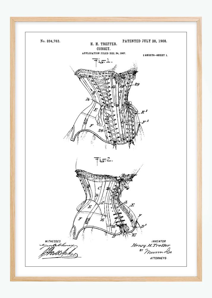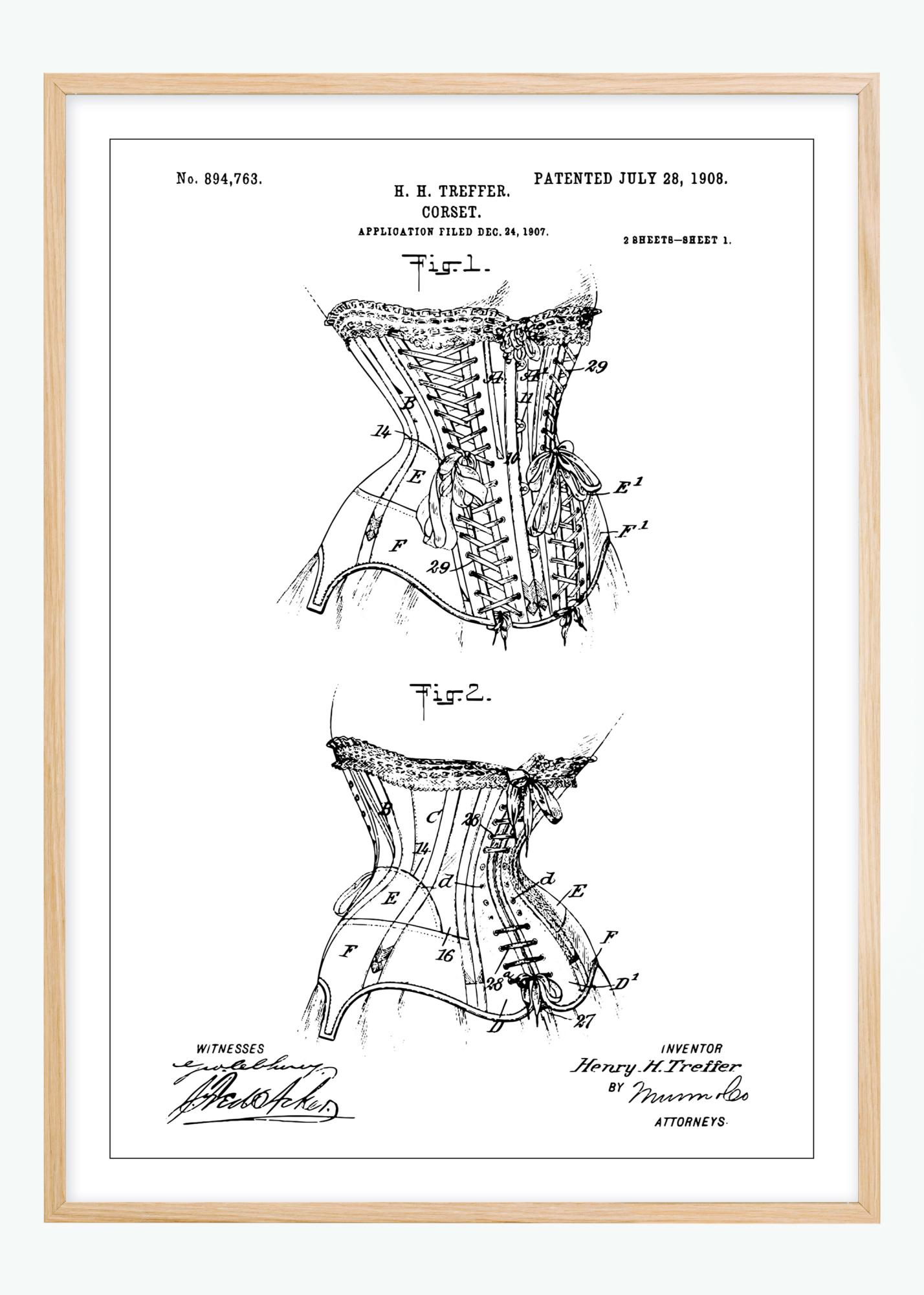 Ez a szabadalmi poszter egy fűző rajzát ábrázolja, amely egy Henry H. Treffer által 1908. július 28-án szabadalmaztatott divattervezési újítás, a szabadalom száma 894,763. Az illusztrációk a fűző részletes kidolgozását mutatják be a fűzőkkel és szerkezetével, kiemelve az adott időszak ruhagyártását és annak hangsúlyát a sziluettre és formára.