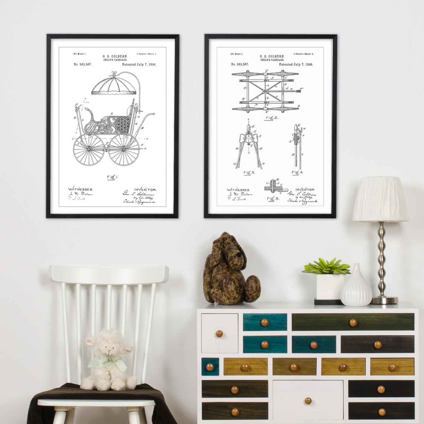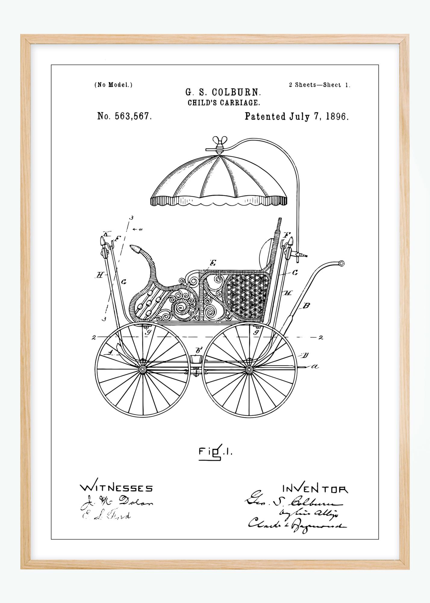 Ez a bájos szabadalmi poszter egy 1800-as évek végi babakocsit ábrázol, 563,567 szabadalmi számmal, amelyet 1896. július 7-én adtak G.S. Colburn-nak. A rajz részletgazdagsága megragadja a kor művészetét és találékonyságát, így ez a poszter kiváló díszítőelem mindazoknak, akik értékelik a történelmi kézművességet és designt. Az illusztráció egy nosztalgikus babakocsit mutat be, hegyes kerekekkel és elegáns napellenzővel, amely tükrözi egy letűnt kor eleganciáját és stílusát.