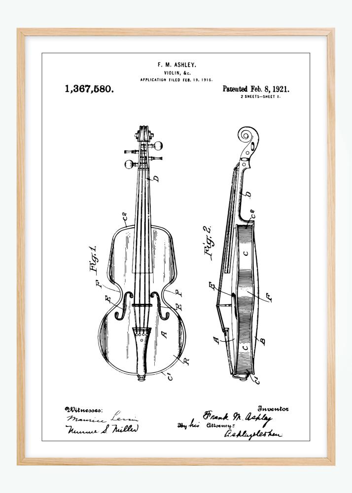 Ez az elegánsan megtervezett szabadalmi poszter egy klasszikus találmányt, egy hegedűt mutat be az 1,367,580-as amerikai szabadalomból. A szabadalmat 1921. február 8-án adták ki F. M. Ashley feltalálónak, akinek aláírása személyes jelleget kölcsönöz ennek a történelmi dokumentumnak. Hagyományos és időtálló megjelenésével ez a szabadalomrajz tisztelgés a zene és a kézművesség világa előtt.