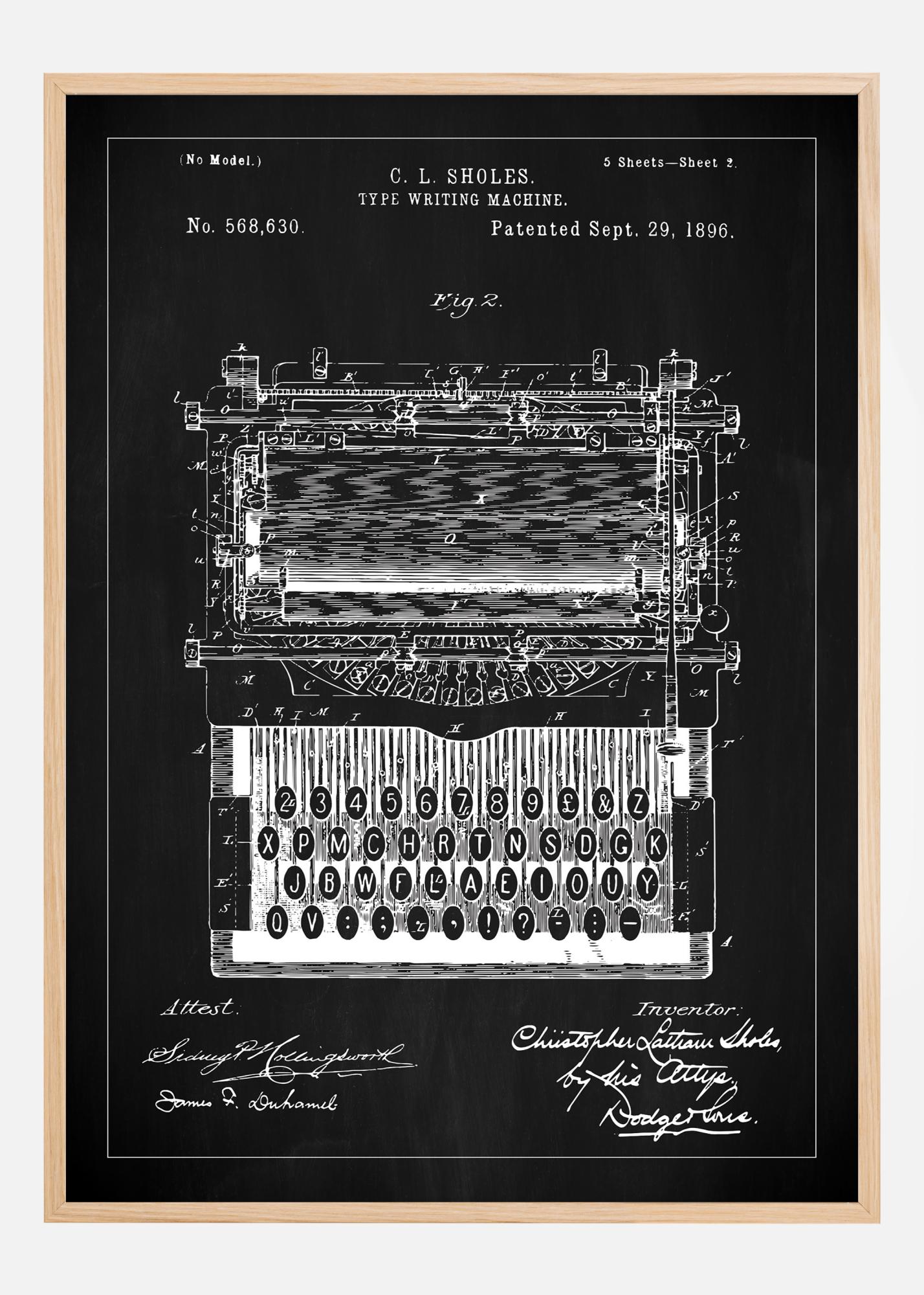 Ez az ikonikus szabadalmi poszter az 568 630-as számú történelmi szabadalmat ábrázolja, amelyet 1896. szeptember 29-én adtak ki C. L. Sholes számára egy írógépre. A méltóságteljes illusztráció az írógép korai mechanikai összetettségét mutatja be, teljes billentyűzet-elrendezéssel és belső mechanizmusokkal. Az összetett típusszerkezet és a szépen elrendezett billentyűzet részletei kiemelkednek a mélyfekete háttérből, régies eleganciát kölcsönözve.