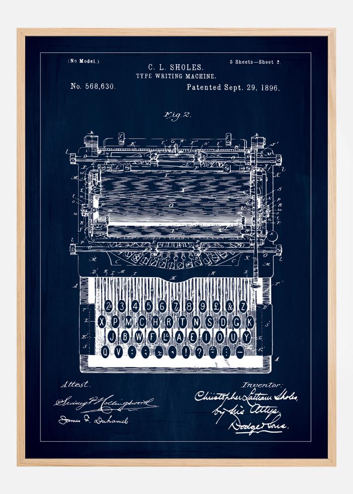 Csodálja meg ezt a különleges szabadalmi posztert, amely a történelmi írógép feltalálását ábrázolja, a 568,630-as szabadalmi számmal, amelyet C. L. Sholes-nek ítéltek oda 1896. szeptember 29-én. Ez a szabadalmi rajz nemcsak egy korai gépíró eszköz vizuális ábrázolása, hanem a kommunikáció történetének egy darabja is, amely lenyűgöző fehér vonallal került bemutatásra sötétkék háttéren, erős és vonzó kontrasztot teremtve.