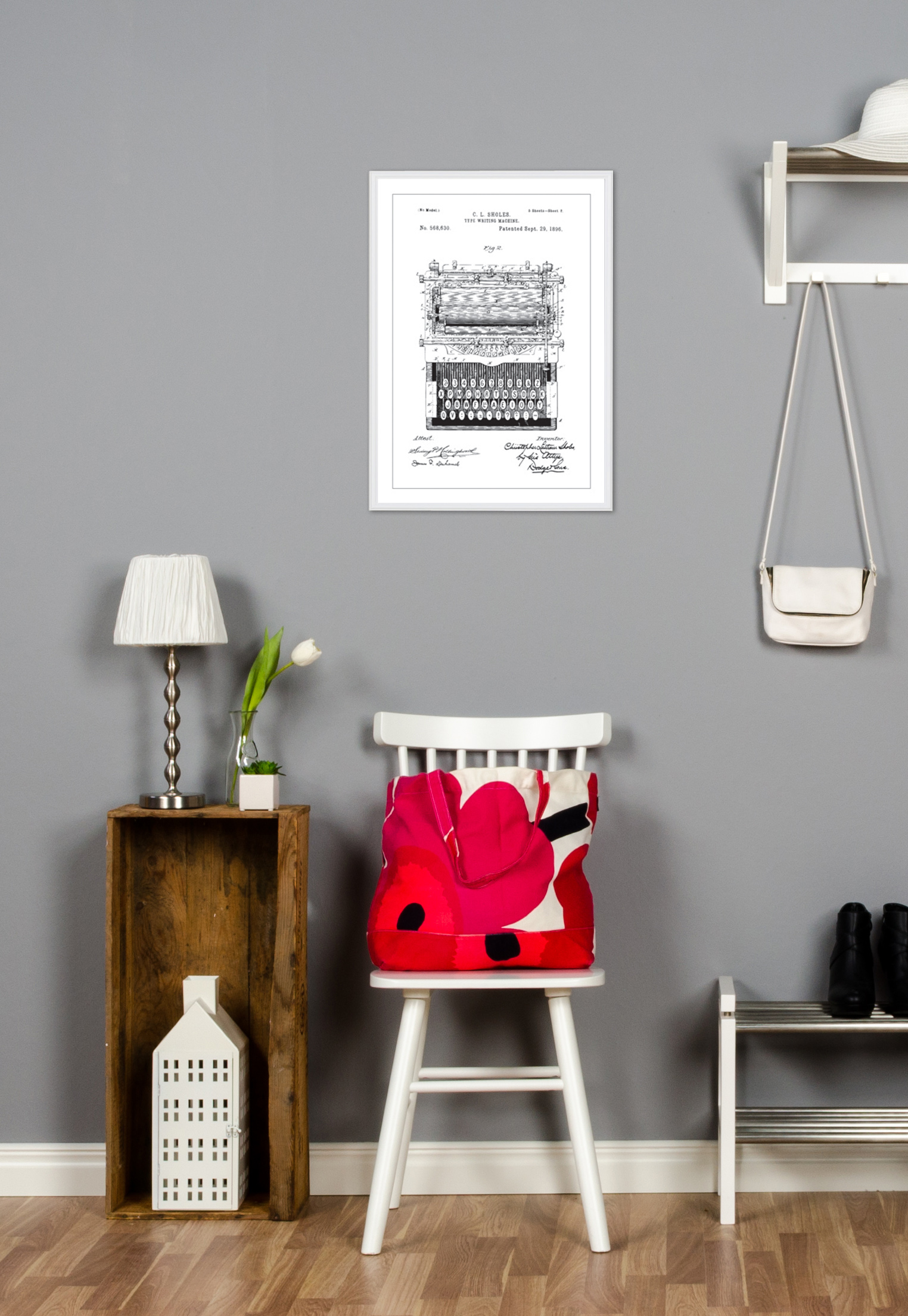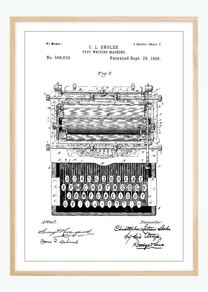 A 2. ÁBRA az írógép összetett belső nézetét mutatja, beleértve a billentyűzetet és a mechanikai részleteket. Sholes feltaláló aláírása, valamint a két tanú aláírása hiteles és személyes aspektust kölcsönöz ennek a szabadalom poszternek. Kiváló beszédtéma mindazok számára, akik érdeklődnek a technológia és a történelem iránt, és kiválóan mutatna egy iroda, könyvtár vagy egy gyűjtő helyiség falain.