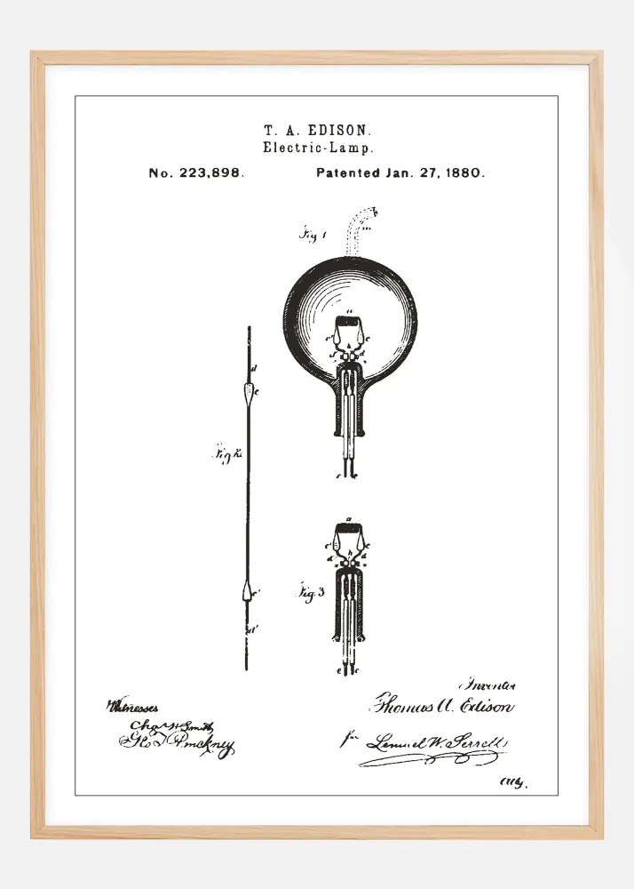 Ez az időtlen szabadalmi poszter Thomas A. Edison áttörést jelentő elektromos lámpáját mutatja be, amely 1880. január 27-én kapta meg a 223 898-as szabadalmi számot, és azóta világítja meg életünket. Ez a stílusos és oktató jellegű poszter tiszteleg az egyik legnagyobb találmány előtt, és egyedülálló betekintést nyújt a technológiai innovációba. A rajz részletei feltárják az izzólámpa feltalálásának aprólékos folyamatát, amely központi szerepet játszik mindennapi életünkben. Ez a poszter nagyszerű beszélgetésindító és inspirációs forrás, ideális mindazok számára, akik értékelik a történelmi technológiát és dizájnt.