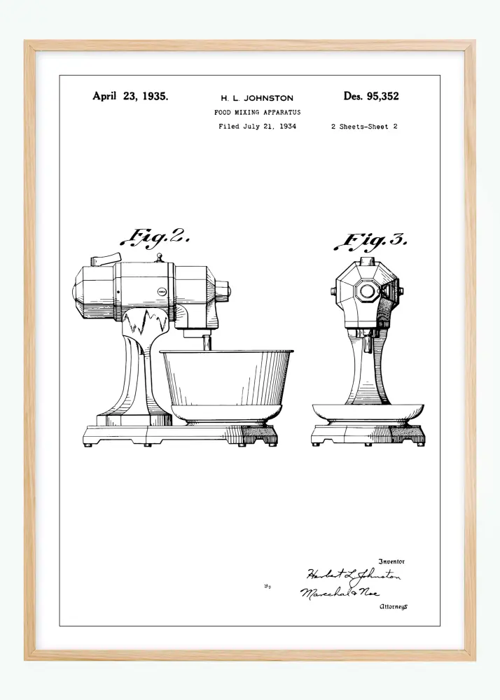 Ez a gondosan részletezett szabadalmi plakát egy ételkeverő készüléket ábrázol, amely egy konyhai alapvető eszköz, ami forradalmasította a főzés művészetét. A szabadalmat H.L. Johnston tervezte 1935. április 23-án, a Des. 95,352 szám alatt, és bemutatja az álló mixer korai dizájnját, ami nélkülözhetetlenné vált a modern főzésben. Az ábra két nézetben mutatja be a készüléket, átfogó betekintést nyújtva annak felépítésébe és működésébe.