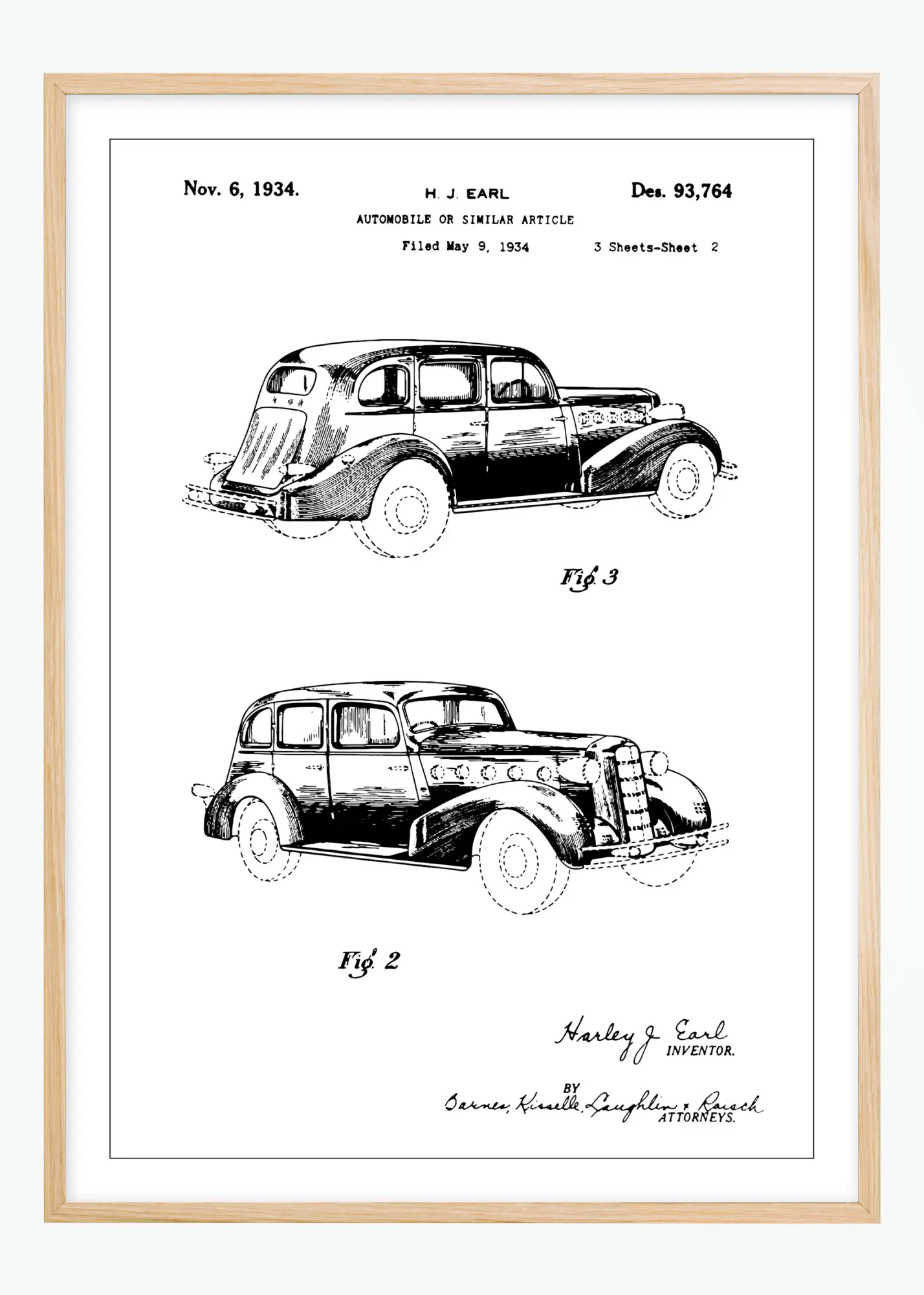 Ez a szabadalmi plakát egy autó designját ábrázolja, amelyet H.J. Earl szabadalmaztatott 1934. november 6-án, a Des. 93,764 szabadalmi szám alatt. A designra vonatkozó kérelmet 1934. május 9-én nyújtották be. A rajzon az autó két oldalsó nézete látható, amely részletes képet ad a jármű elegáns vonalairól és jellegzetes karakterjegyeiről, amelyek az 1930-as évek autóiparára voltak jellemzők.