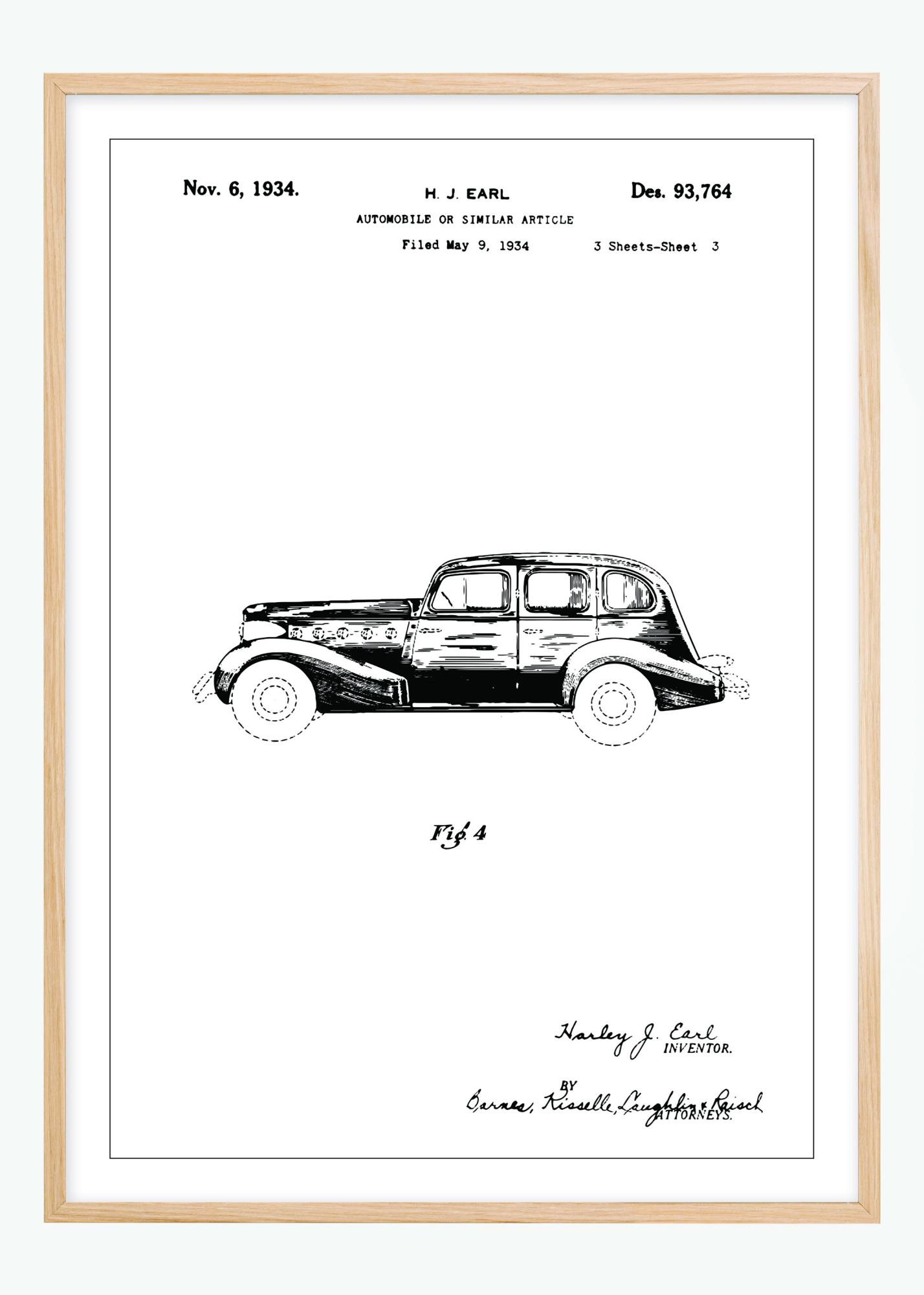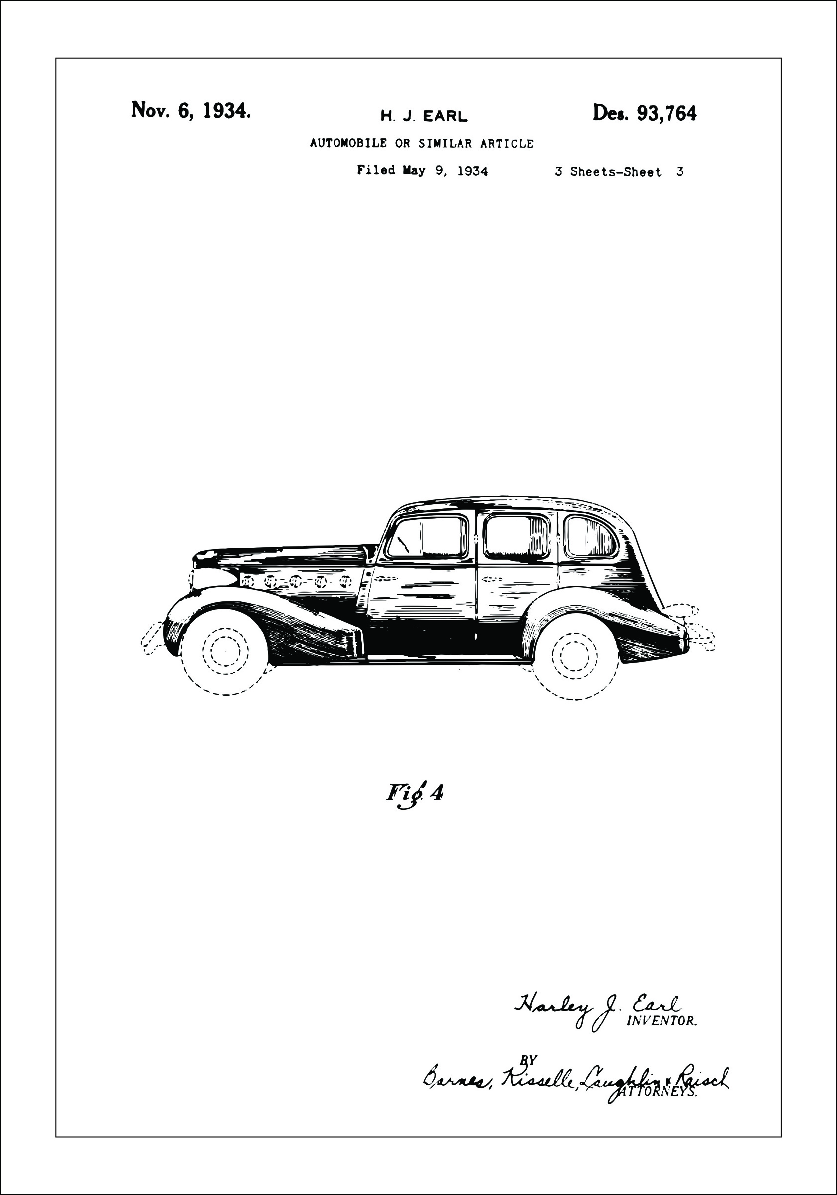 Ez a szabadalmi poszter egy autót ábrázol, amelyet H.J. Earl szabadalmaztatott 1934. november 6-án, a Des. 93,764 szabadalmi szám alatt. A találmány egy autóra vagy hasonló tárgyra vonatkozik, amelyet a 1934. május 9-én benyújtott kérelmében adtak meg. A rajz az jármű oldalnézetét mutatja be, amely világos képet ad annak a korszaknak megfelelő formatervezéséről és arányairól.