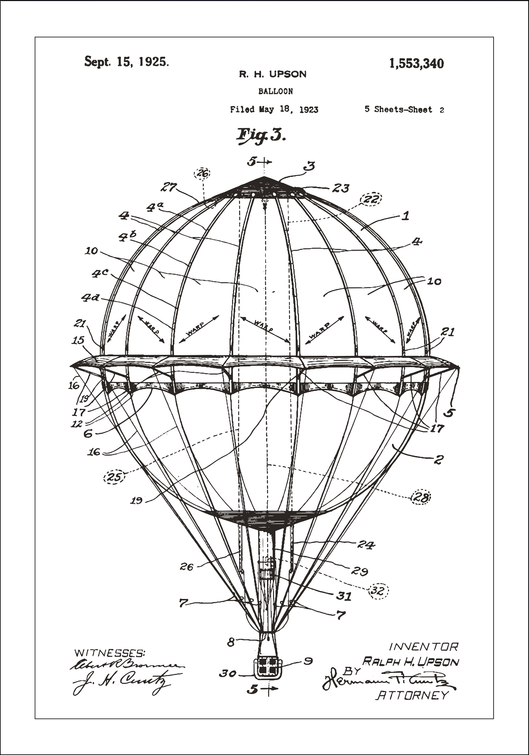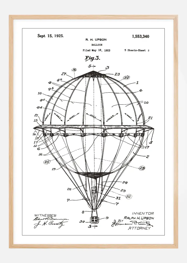 Merüljön el a korai innováció világába ezzel az exkluzív szabadalmi poszterrel, amely Ralph H. Upson egyik nagy találmányának, egy légballon tervezését mutatja be. Az 1925. szeptember 15-én kiadott szabadalom, amelynek regisztrációs száma 1,553,340, rendkívüli részletgazdagságot és zsenialitást tükröz. Tökéletes művészi részlet mindazoknak, akik vonzódnak a repüléstörténethez és a konstrukcióhoz.
