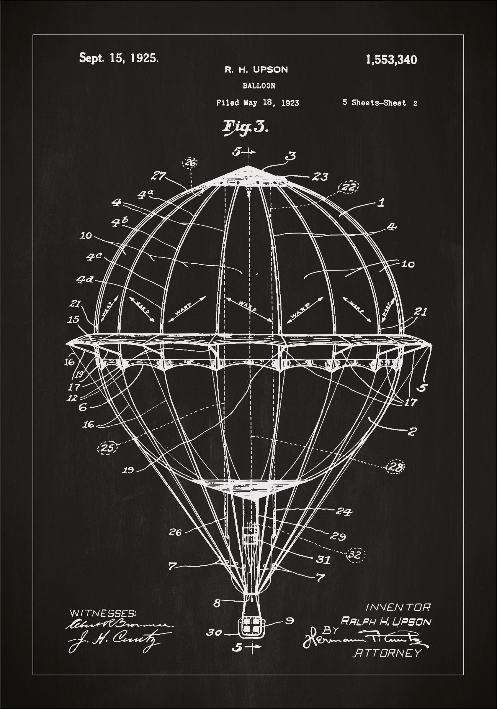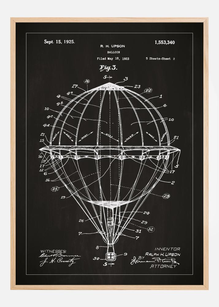 Ez az egyedileg készült szabadalomposzter részletesen ábrázolja egy légballon szerkezetét, melynek eredeti szabadalmát Ralph H. Upson újító készítette. Az 1925. szeptember 15-én, az 1,553,340-es szám alatt szabadalmaztatott darab lenyűgöző példája a korai aerodinamikai mérnöki tárgyaknak. Ez a szabadalomposzter tisztelettel adózik a felhők között lebegés álmának és az emberiség égbolt felfedezésére irányuló törekvésének.