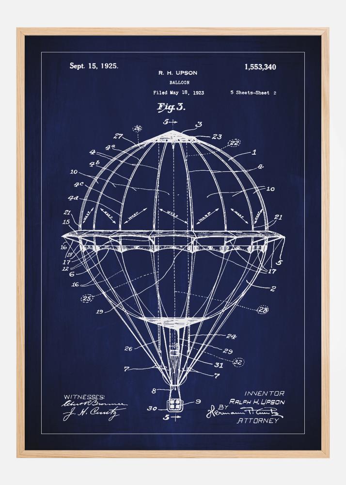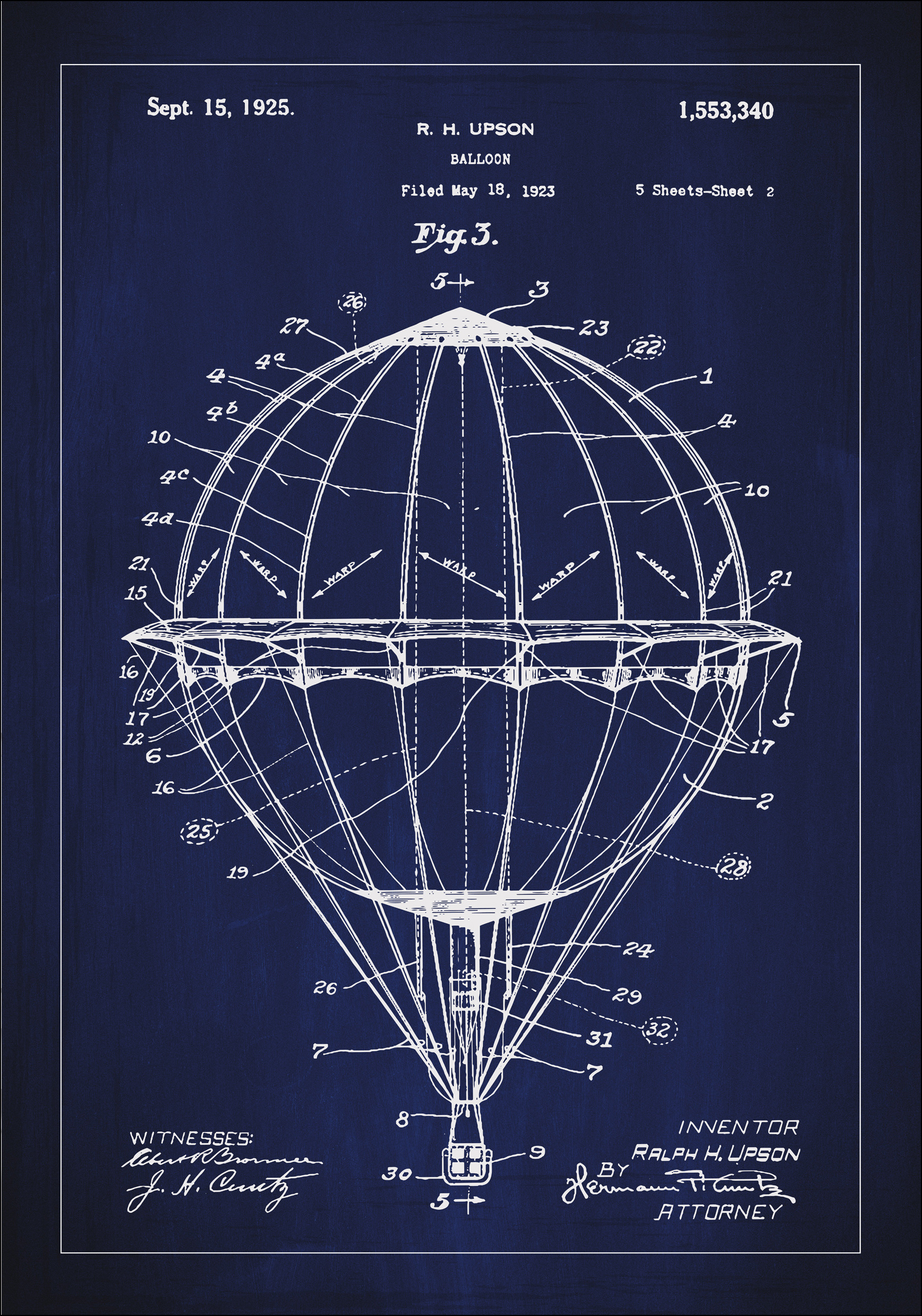 A korai repüléstechnikai fejlődés igazi rajongóinak számára ez a szabadalmi poszter bepillantást kínál a légi közlekedés úttörőinek dicsőséges korszakába. Az 1925. szeptember 15-én bemutatott, 1,553,340 számú szabadalmi rajz egy léghajót mutat be, melyet Ralph H. Upson tervezett, és amely fontos mérföldkő az aerodinamikai tervezés és konstrukció területén. Ez a poszter az emberi törekvések és a légi kalandokról szóló álmok felbecsülhetetlen értékű reprezentációja.