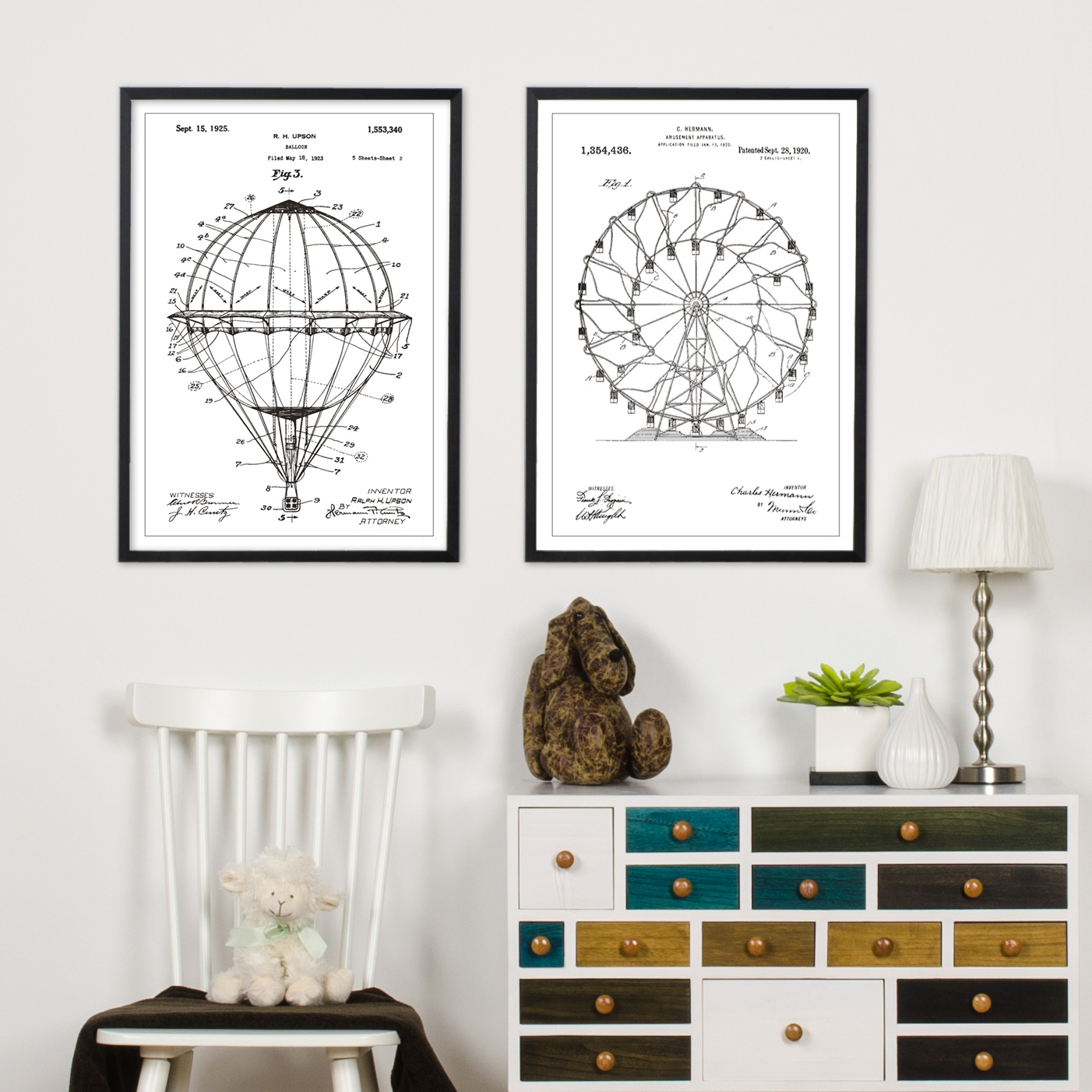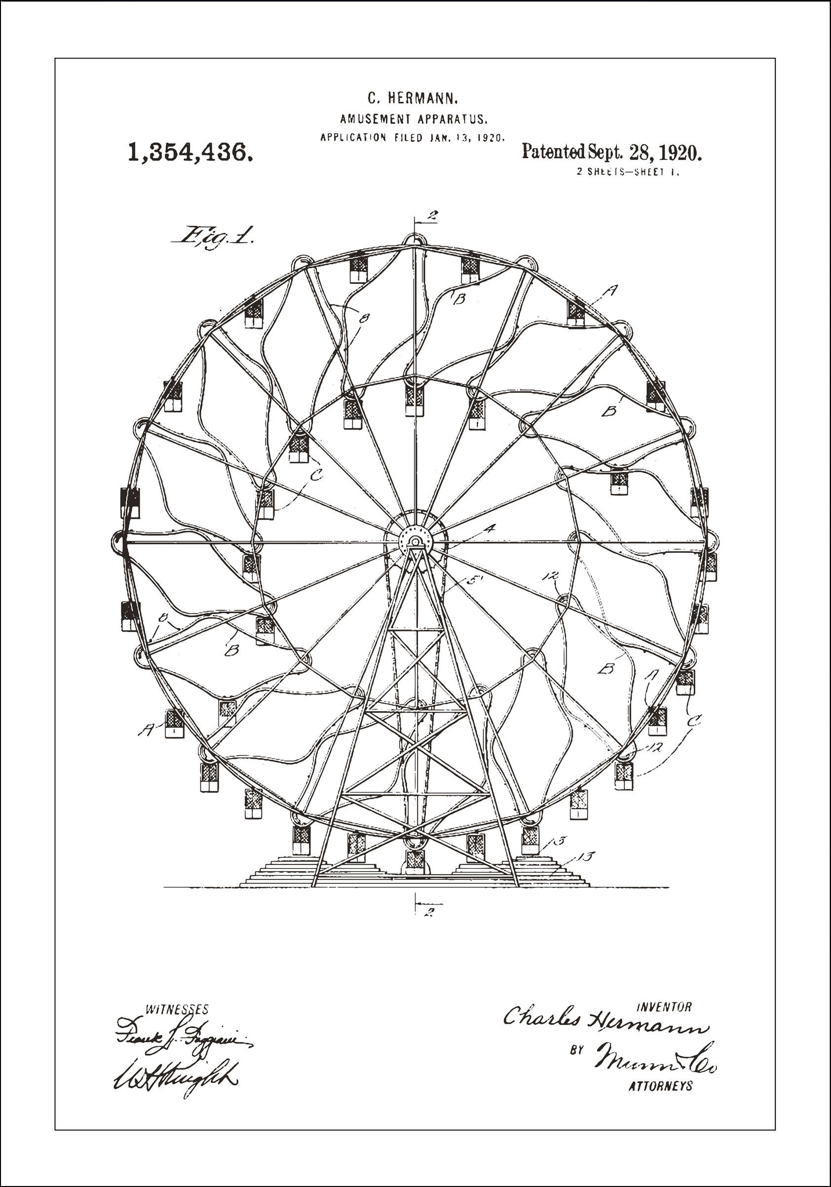 Ez a szabadalomposzter C. Hermann találmányát mutatja be, egy szórakoztató eszközt, amelyet örömre és izgalomra terveztek, az 1,354,436 szabadalomszám alatt engedélyezve 1920. szeptember 28-án. A dizájn a klasszikus és szeretett óriáskertet ábrázolja, amely a vidámparkok szimbóluma szerte a világon. Ez a precíz műszaki rajz megragadja a szerkezet összetettségét, és tisztelgés a szórakoztatóipar korai napjai előtt.