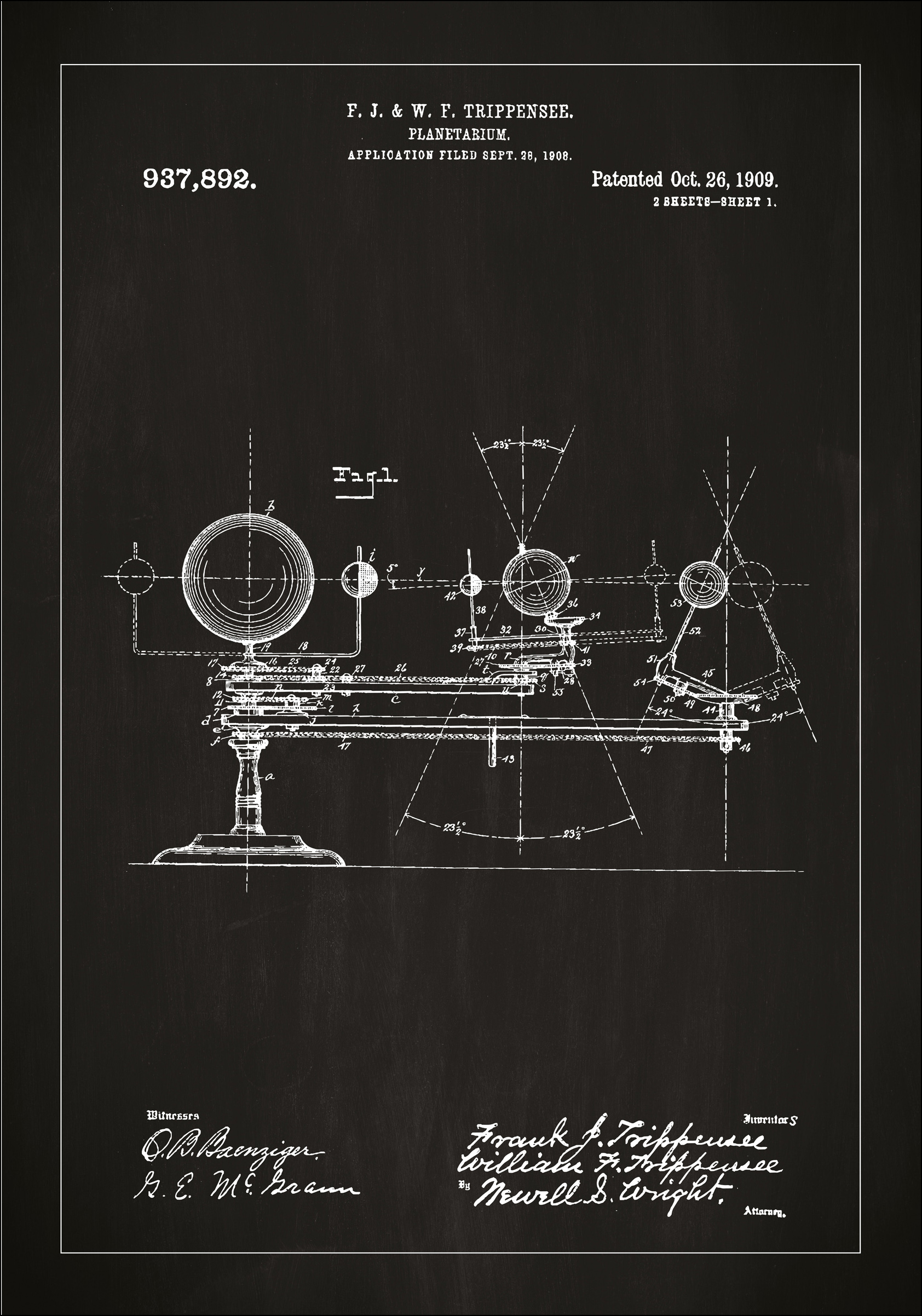 Ez a gondosan megtervezett szabadalmi poszter egy planetáriumot mutat be, egy eszközt, amely utat nyitott az égitestek mozgásának tanulmányozásához. A szabadalmi rajz F. J. & W. F. Trippensee tervezését ábrázolja, amely a 937 892-es szabadalmi számot kapta meg 1909. október 26-án, a 1908. szeptember 28-i kérelem után. Az építmény minden részlete és alkotóeleme szépen van visszaadva, feltárva ennek a csillagászati oktatási segédeszköznek a bonyolultságát és precizitását. Egy elbűvölő és inspiráló kép mindazok számára, akik rajonganak a csillagos égboltért és azokért az oktatási eszközökért, amelyeket a felfedezéséhez használtak.