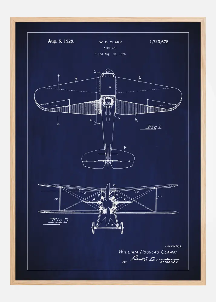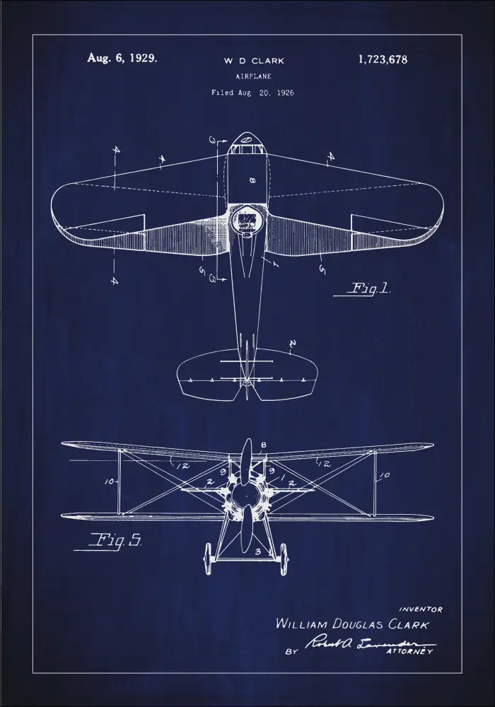 Hozzon létre repülési történeti hangulatot ezzel a szabadalmi plakáttal, amely W D Clark innovatív repülőgép-tervét mutatja be. Ezt a repülőgépet 1929. augusztus 6-án engedélyezték a 1,723,678 szabadalmi számmal, és forradalmi időszak ikonjává vált a repüléstechnika területén. A sötét háttér szépen kontrasztál a részletes fehér vonalakkal, és elegáns, átgondolt dekoratív részletet hoz létre.