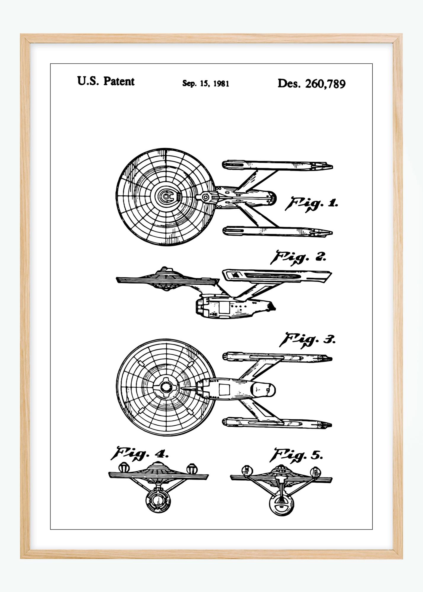 Ez a szabadalmi poszter a StarTrek Enterprise részletes rajzát mutatja, amelyet 1981. szeptember 15-én kapott meg szabadalmi szám alatt, Des. 260,789. Az öt ábra különböző szögekből szemlélteti a ventilátort, átfogó nézetet nyújtva annak szerkezetéről és kialakításáról. A rajzok kiemelik ennek a mindennapi eszköznek a technikai felépítését és esztétikai megjelenését.