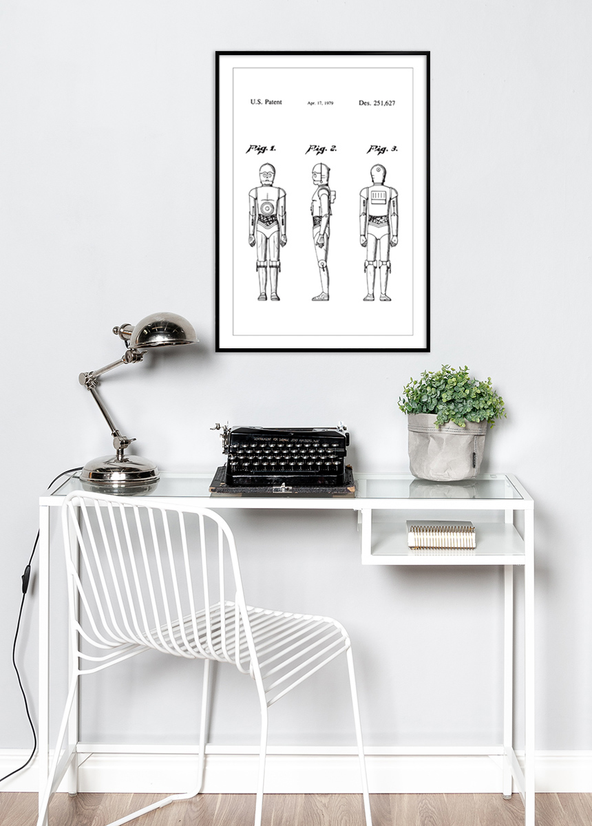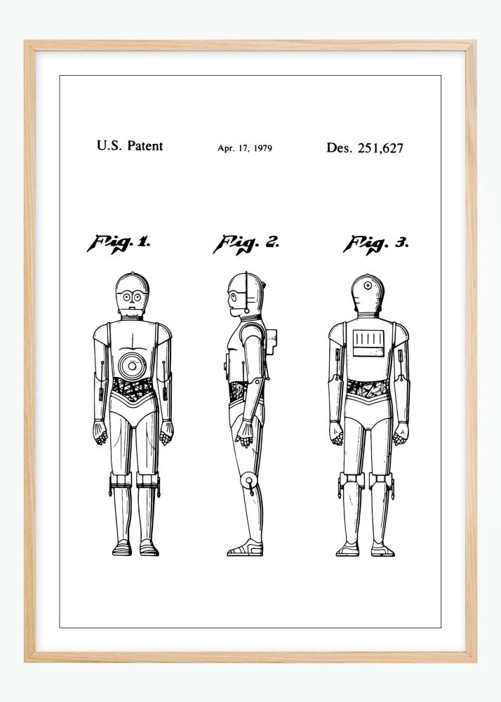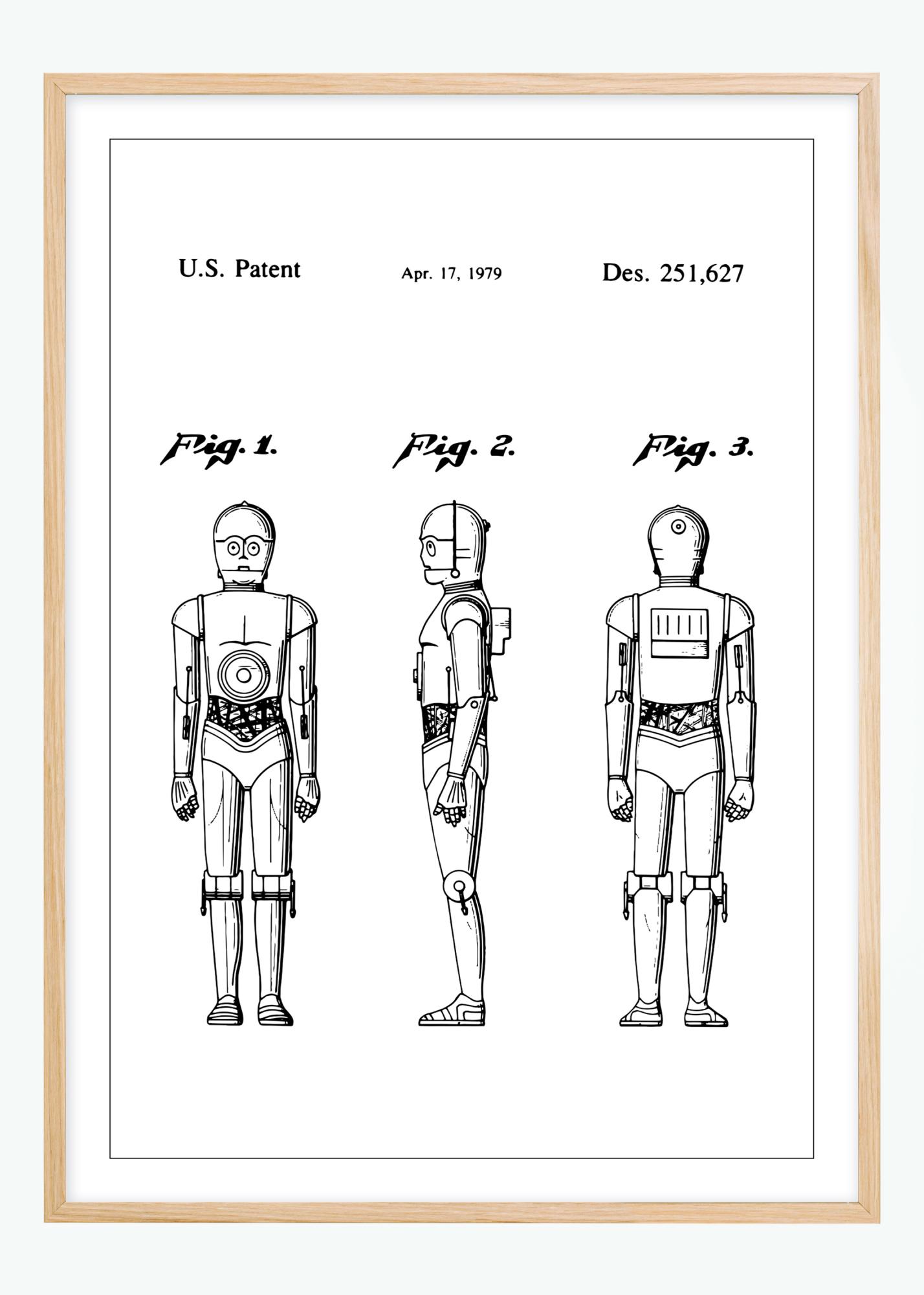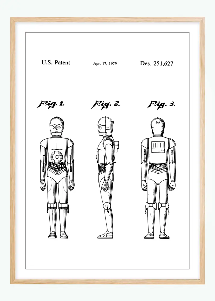Ez az egyedülálló szabadalmi poszter egy C3PO-t ábrázol a StarWars-ból, az 1979. április 17-én kiadott U.S. patent Des. 251,627 alapján. A figura három különböző szögből van ábrázolva, teljes áttekintést nyújtva a dizájnról. Ez a poszter megragadja a korai robottechnika iránti vonzalmat és annak potenciális alkalmazási területeit. Részletgazdag és technikailag kidolgozott képével tökéletes falidekoráció a technika rajongóinak és a retrofuturizmus híveinek.