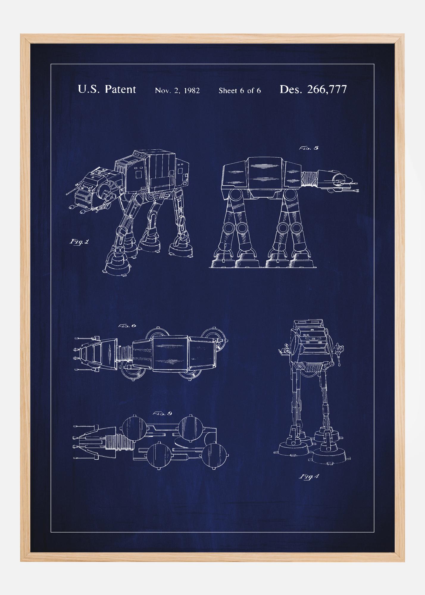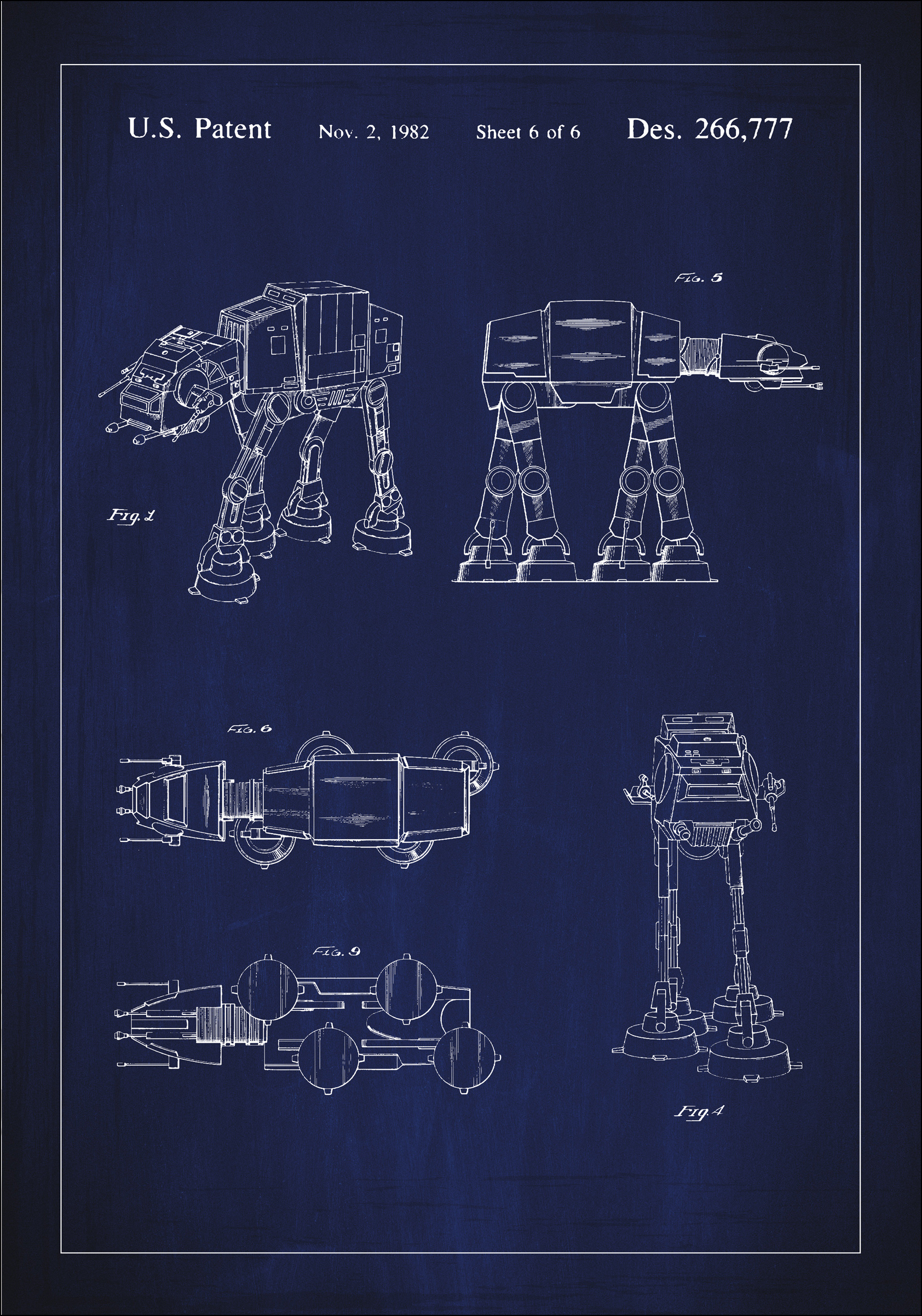 Ez a művészi szabadalomposzter a híres Des. 266,777-es designszabadalom jellegzetes konstrukciós rajzait ábrázolja, amelyet 1982. november 2-án jegyeztek be. A téma Star Wars ATAT műszaki rajzait mutatja be több nézetben, mindegyik bemutatja az egység egyedi szerkezetét és funkcióit. Mélykék háttérrel van bemutatva, ami elegáns és modern kifejezést kölcsönöz a fehérvonalas illusztrációknak.