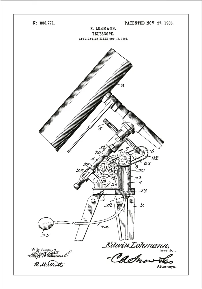 Ez a szabadalmi poszter egy teleszkópmesteri designját ábrázolja, amelyet E. Lohmann talált fel, és 1906. november 27-én szabadalmaztatták a 836,771. szám alatt. A rajz részletgazdagsága kiemeli az optikai eszköz technikai összetevőit és mechanikai összetettségét. A fekete-fehér illusztráció a fekete háttér előtt erős vizuális kontrasztot kínál, amely fokozza Lohmann designjának technikai eleganciáját, és keresett dekorációs elemmé teszi minden tudomány- és csillagászat iránt érdeklődő számára.