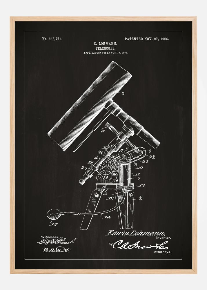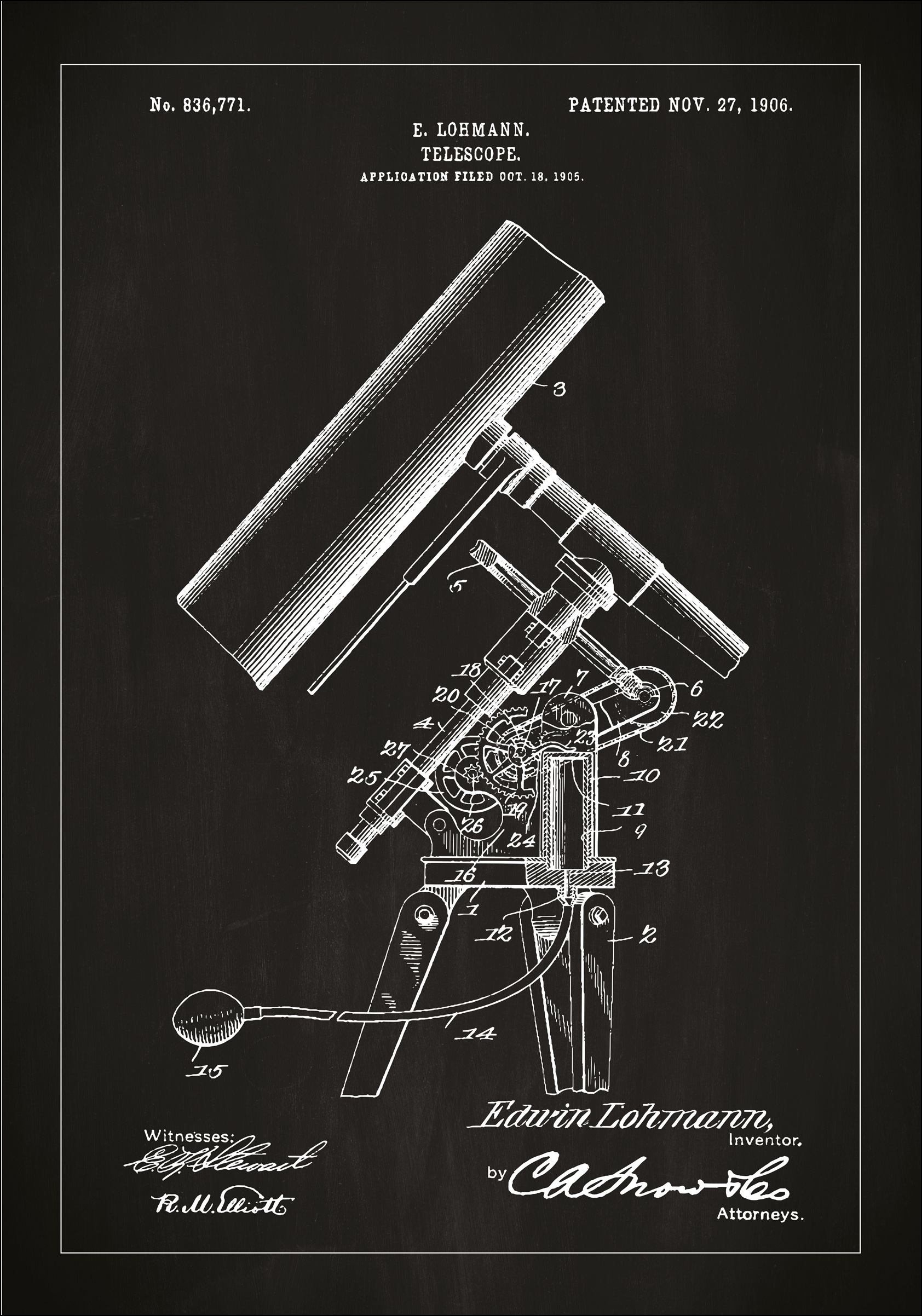 Ez a részletes szabadalmi poszter E. Lohmann távcsövét ábrázolja, amelyet 1906. november 27-én szabadalmaztattak, 836,771 szabadalmi számmal. Az illusztráció gondos precizitással ragadja meg a teleszkóp összetett mechanikáját és finommechanikai részleteit. A poszter merész kontrasztja a bonyolult vonalak és a sötét háttér között figyelemfelkeltő lakberendezési részlet, amely egyben tiszteleg az asztronómia és az optika gazdag történelme előtt. Ez a korai 1900-as évek tudományos fejlődésének lenyűgöző tisztelete és inspiráló középpont minden tudomány-rajongó számára.