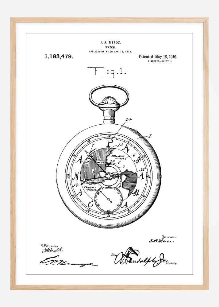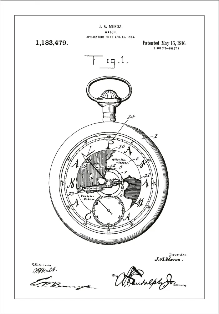 Ez egy lenyűgöző szabadalmi poszter, amely J.A. Meroz óratervezésének részletes vázlatát mutatja, amelyet 1916. május 16-án szabadalmaztattak az 1,183,479 számon. A szabadalmi rajz egy klasszikus zsebóra sziluettjét részletezi az időmérő belső mechanizmusának jellegzetes elemeivel, amely kiemeli a technikai innováció és a mesterségbeli tudás korszakát az óragyártásban.