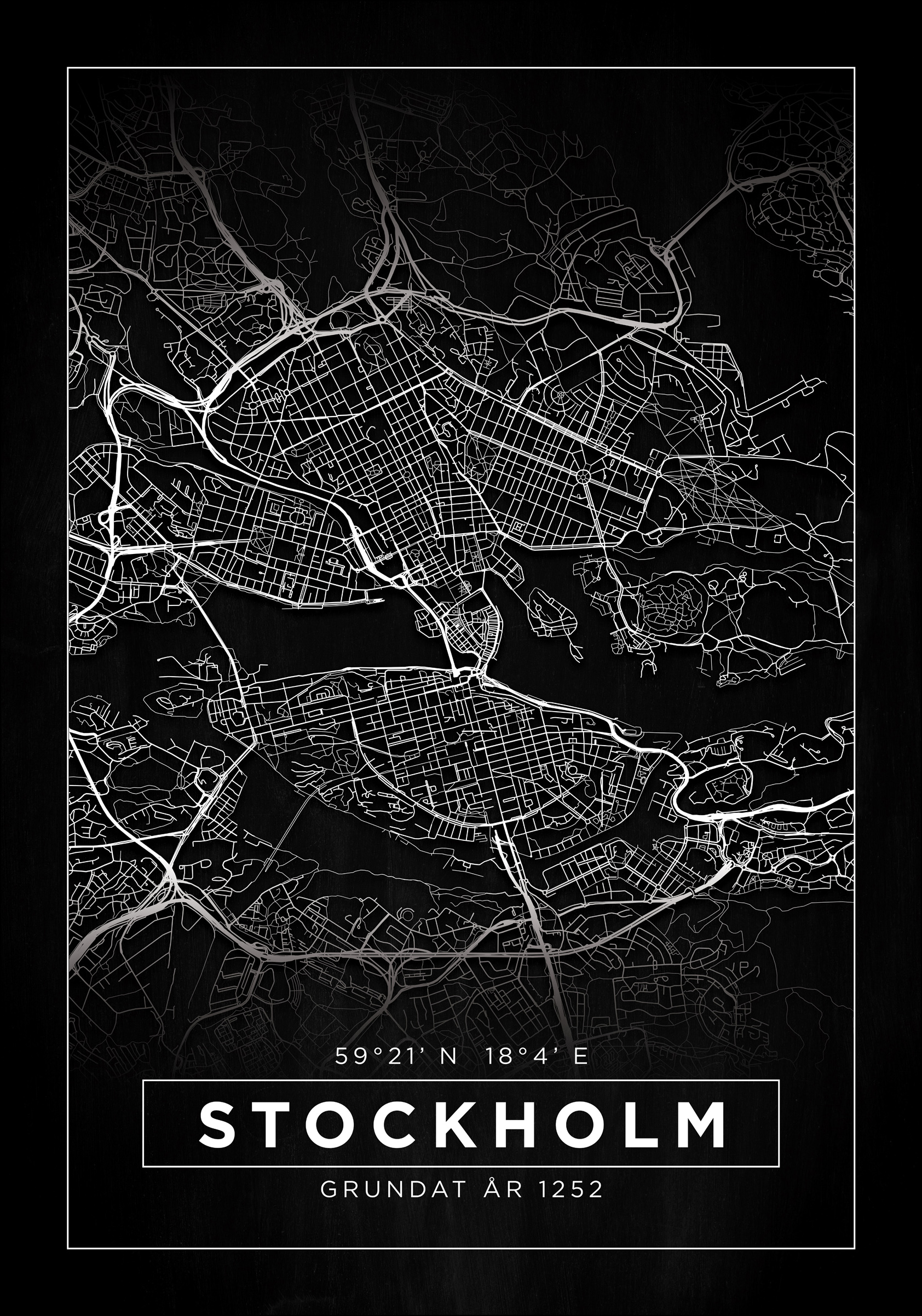 Vannak, akik nehéznek találják a közlekedést Stockholm forgalmas útjain, de ha így kerül ábrázolásra, nem tehetsz mást, mint elcsodálkozol, milyen gyönyörűek. A motívum egy fehér térképet ábrázol Stockholmról, fekete háttérrel. Az alján a "Stockholm, alapítva 1252-ben" szöveg található a koordinátákkal együtt. A város neve körül, valamint a motívum körül fehér, vékony vonalak futnak. Természetesen a poszter többféle méretben kapható! Egészítsd ki bátran egy fehér vagy arany színű kerettel a széles választékunkból.