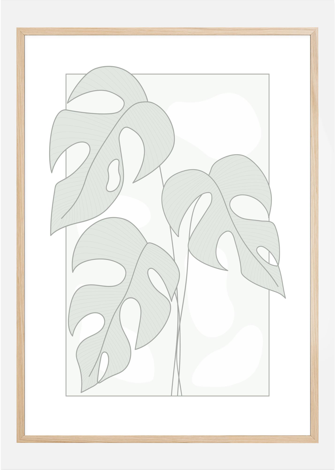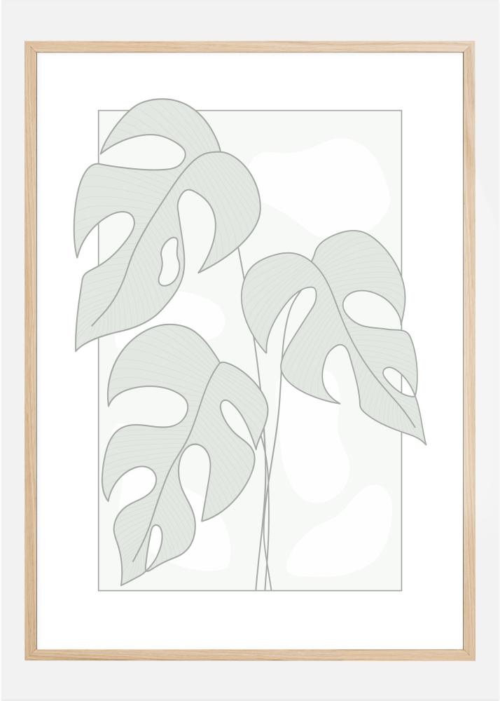 Egyszerű poszter illusztratív monstera levelekkel. Három nagy levél tölti ki a képet, mindegyik puha szürke árnyalatban. Vékony vonalak alkotják a szárakat, miközben ezek az elegáns levelek lyukakkal lecsüngenek ezen a képen. Maradjon visszafogott, és akassza ezt egy finom zöld falra a természet érzéséért.