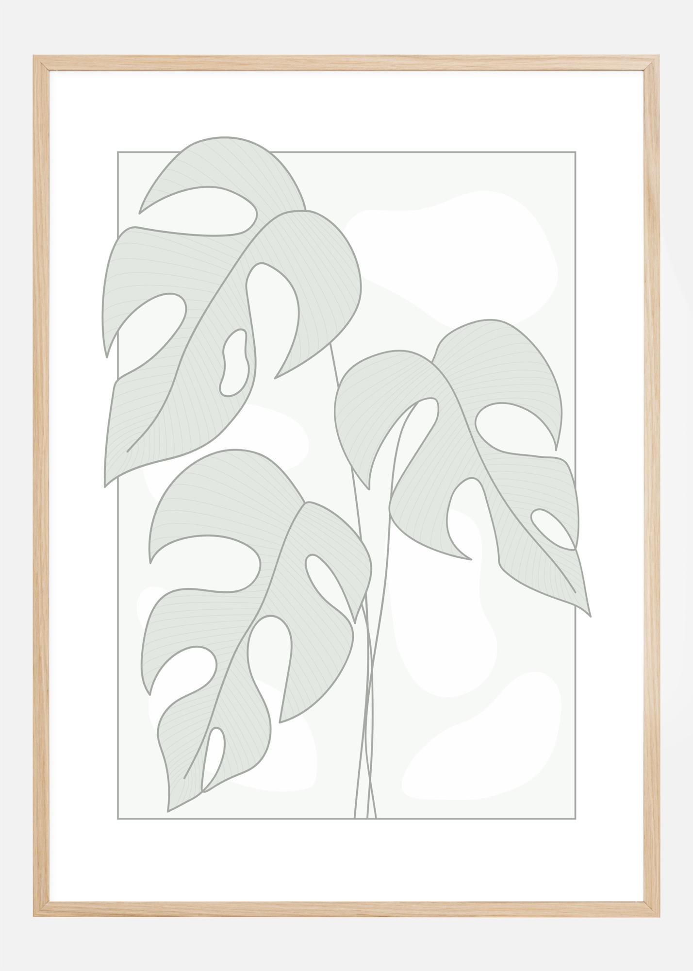 Egy egyszerű poszter illusztratív monstera levelekkel. Három nagy levél tölti ki a képet, mindegyik egy lágy szürke árnyalatban. Vékonyabb vonalak alkotják a szárakat, ahogy ezek az elegáns, lyukas levelek lelógnak ebben a képen. Tartsd diszkréten úgy, hogy ezt egy lágy zöld falra akasztod, hogy természetes érzést keltsen.