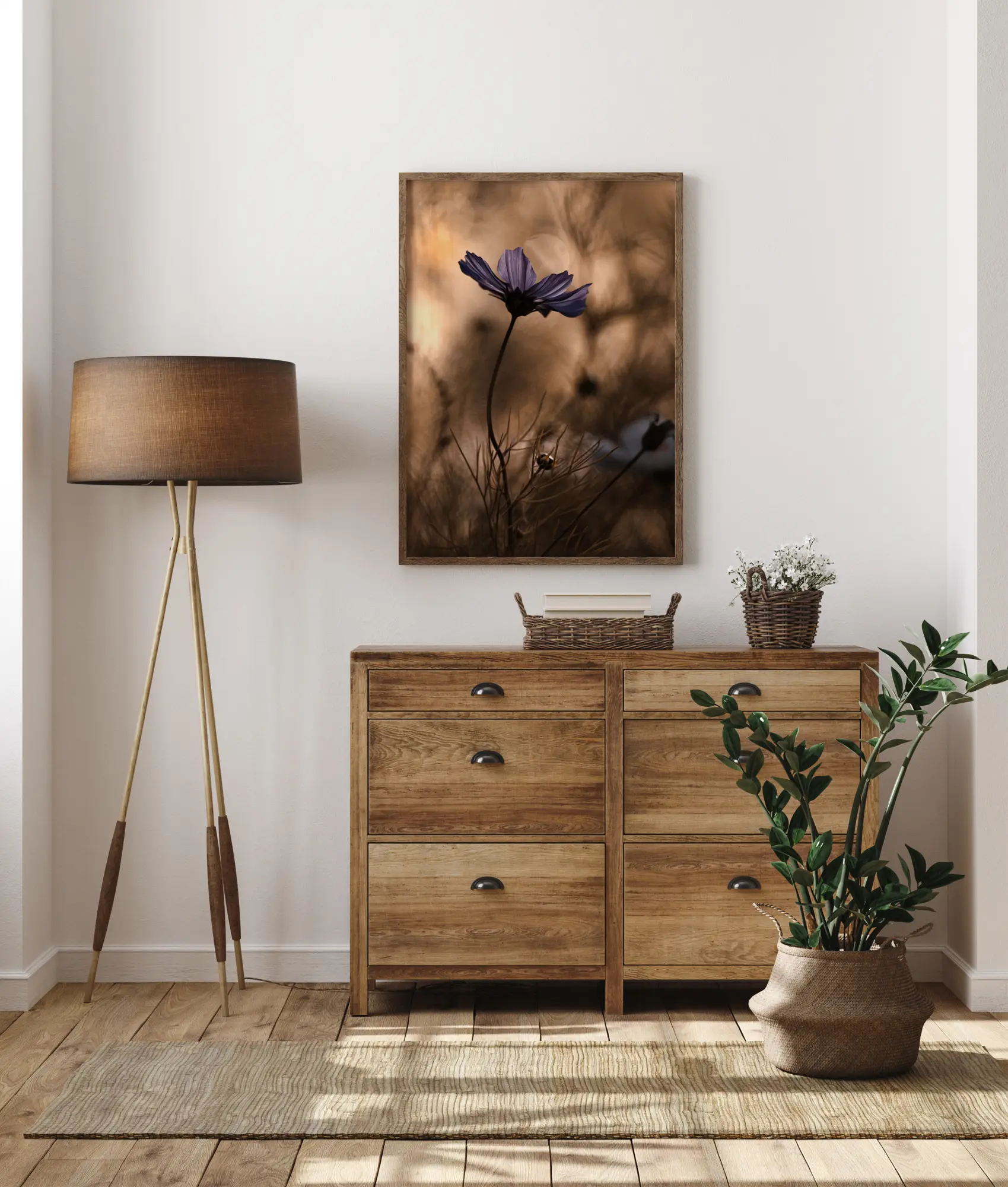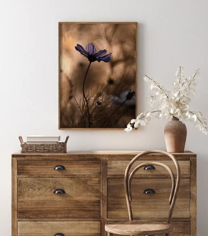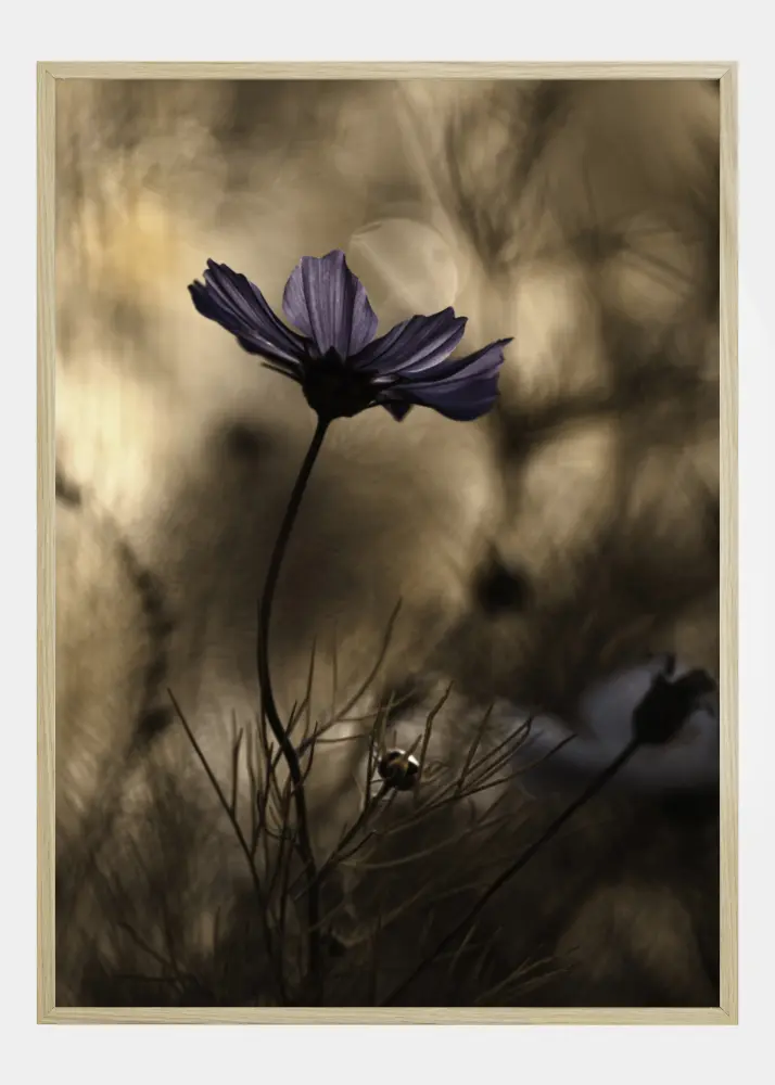 Egy virágposzter világos lila virággal, amely egy puha barna háttér előtt lengedezik. A lila szirmokat drámaian kiemelik a háttérben elmosódott növények. Más formák is láthatók, amikor a tekintet a hajlított szárak mentén mozog, hogy befogadja az egész képet.
