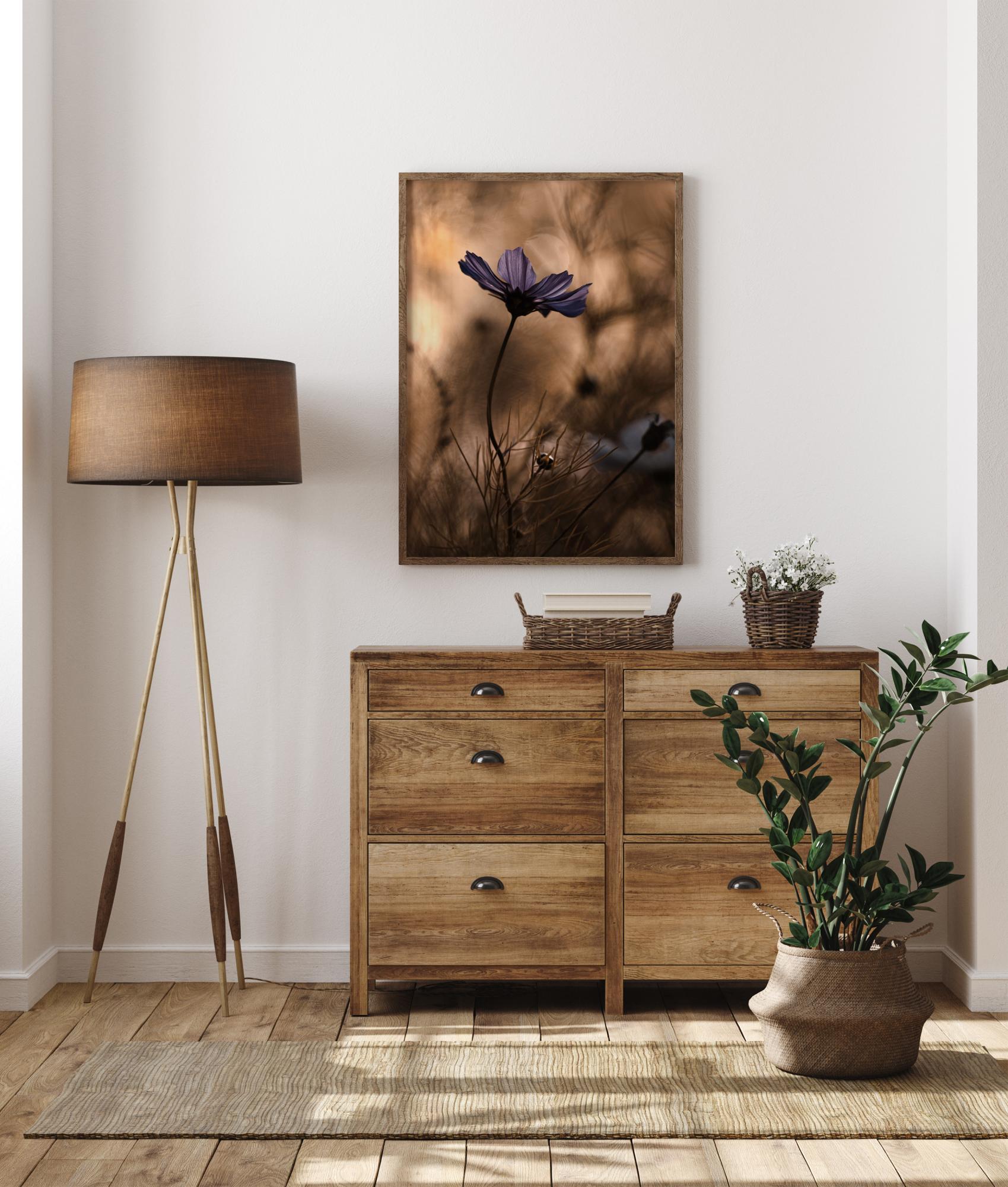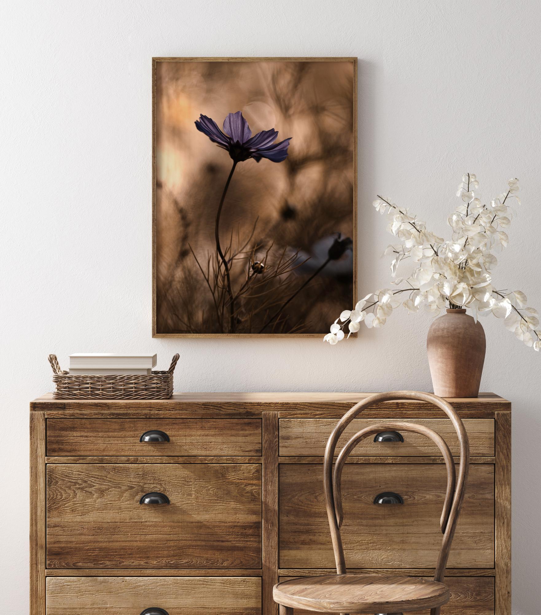Egy virágposzter egy világoslila virággal, amely egy puha barna háttér előtt hajladozik. A lila szirmok drámaian kiemelkednek a háttérben elmosódó növények között. Más formák is megjelennek, amikor a tekintet végighalad a hajlított szárakon, hogy befogadja az egész képet.