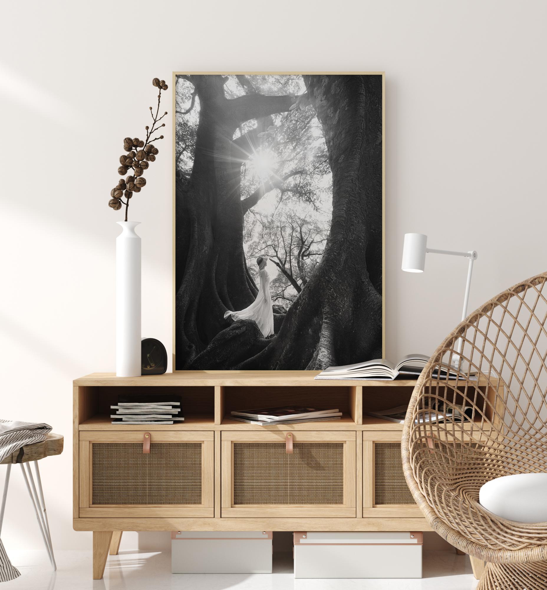 Egy fantasztikus természetposzter hatalmas fákkal, egy napsugárral és egy középen álló nővel. A fénysugár bevonz ebbe a titokzatos fotóba. Békét és nyugalmat varázsol az otthonodba ezzel a képpel.
