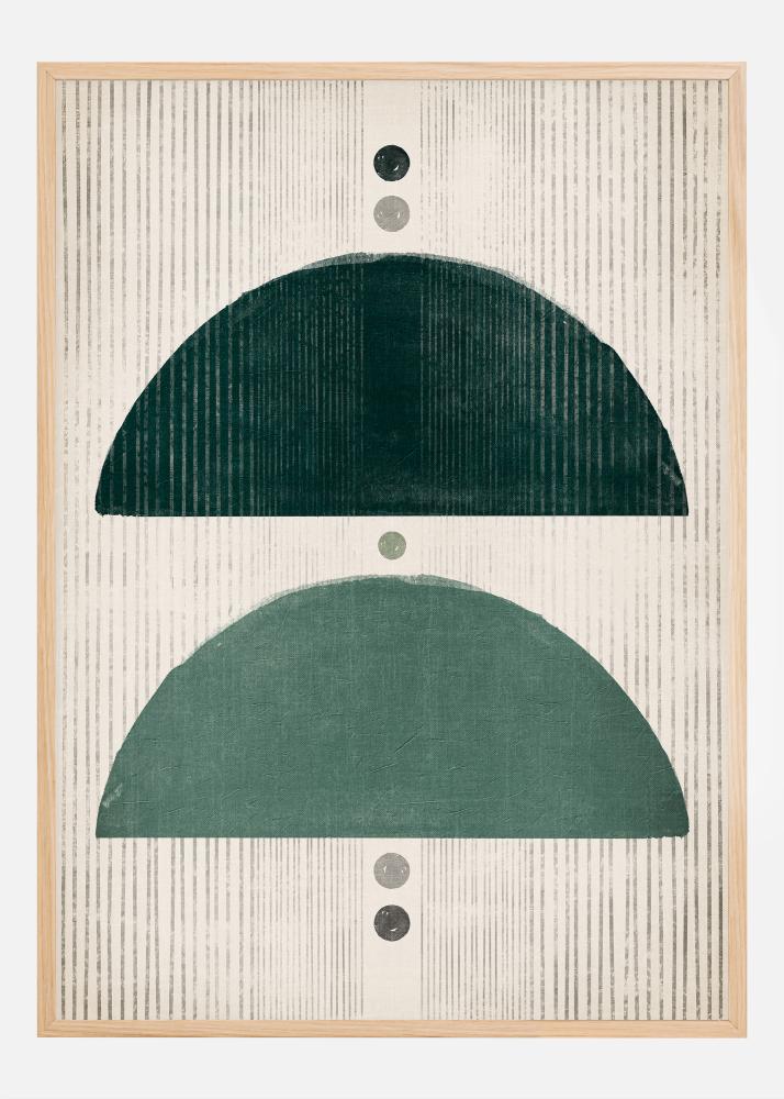 Ez a poszter több, mint egyszerű dekoratív kép; kortárs művészi értelmezés, amely egyesíti a természeteset a stilizálttal. A három kör alakú forma, amely a félkör alakú blokkok között helyezkedik el, egy fókuszpontként működik, amely összeköti a teljes kompozíciót. Ez a nyomat egy elegáns faliként szolgálhat egy minimalista otthonban vagy irodában, és a nyugtató zöld tónusok természetet és nyugalmat vinnének bármely környezetbe.